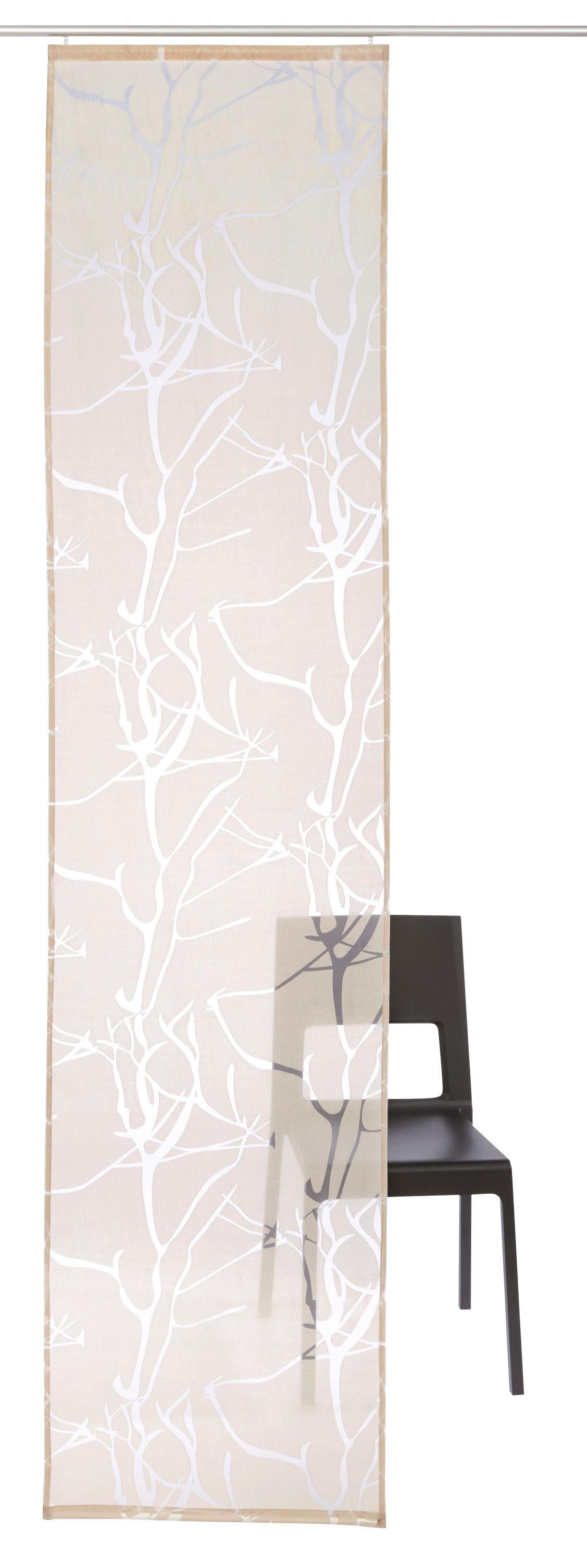 Hinweis Dekoration | Eine Schiebegardine ist eine schmale, glatt hängende Stoffbahn, die sich sowohl als Sichtschutz als auch zur Raumteilung eignet. Durch die Schiebetechnik sind Schiebegardinen sehr flexibel einsetzbar. |