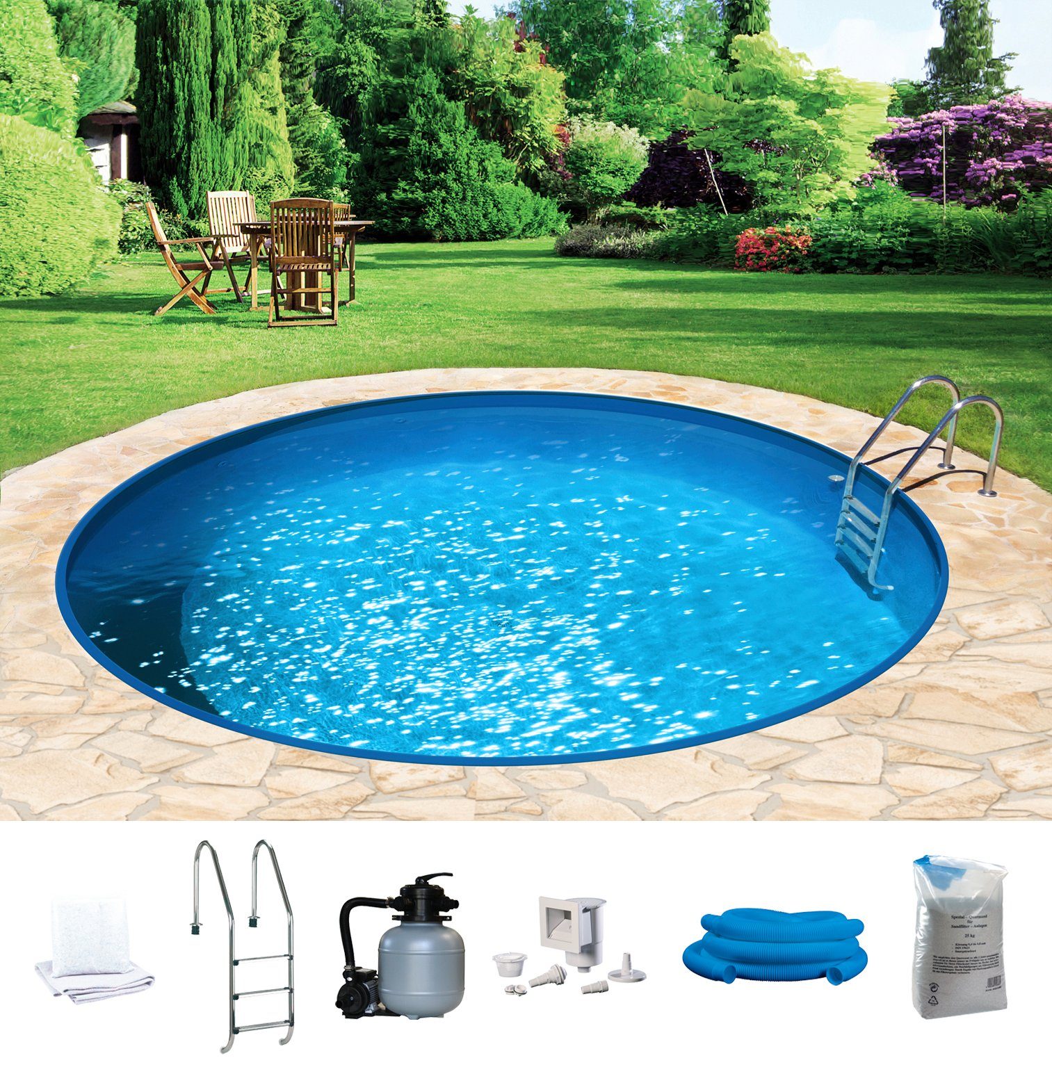 Lieferumfang | Bodenschutzvlies Leiter Quarzsand Sandfilteranlage Skimmerpaket Wasserpflege-Set |