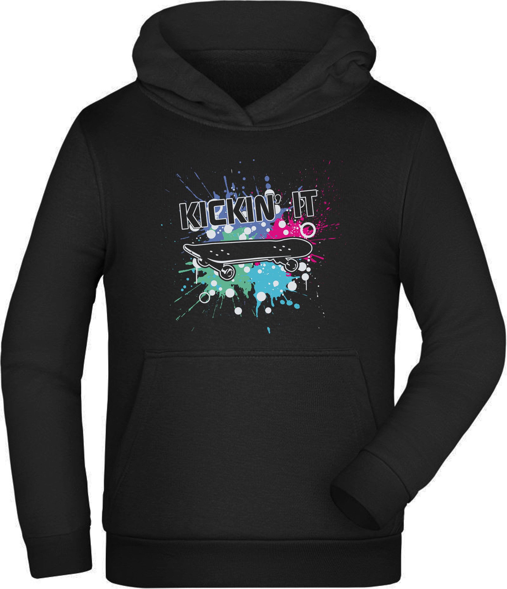 Stylischer Skater-Look: Trendiger Kinder Kapuzensweater mit Skateboard-Print und "Kickin' it" Schriftzug für einen coolen Style.