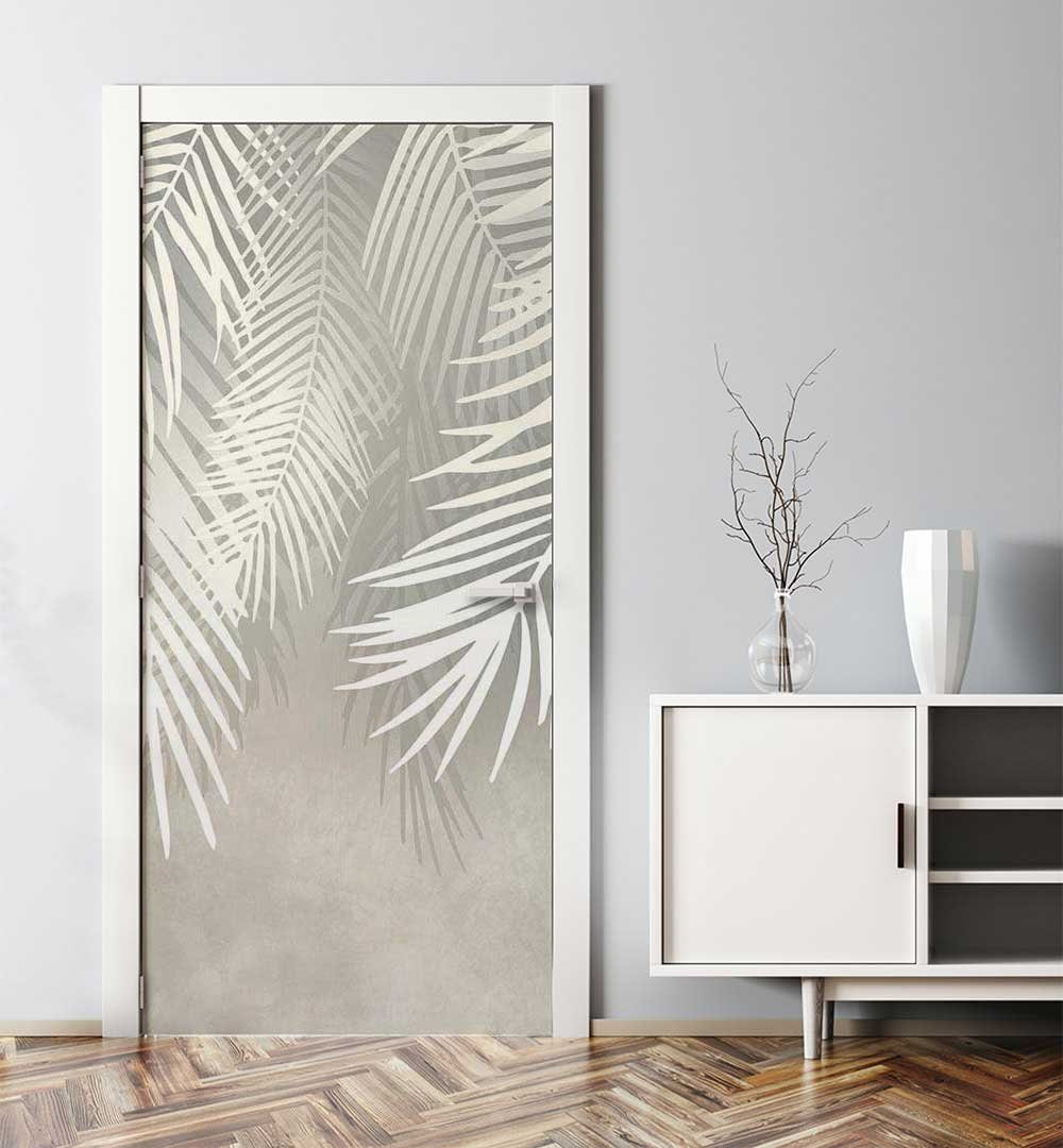 Die Türtapete hängende Palmenblätter silber besteht aus einem qualitativ hochwertigen Vinyl Material und wird mittels moderner Digitaldrucktechnologie mit deinem Wunschmotiv bedruckt.