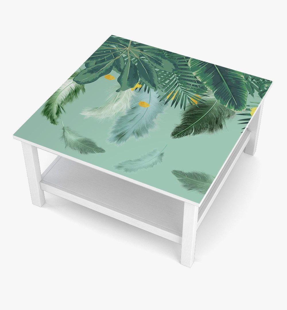 Tischfolie Tropische Blätter mit Federn hängend Bubblefree selbstklebend ist kompatibel mit IKEA Lacktisch.