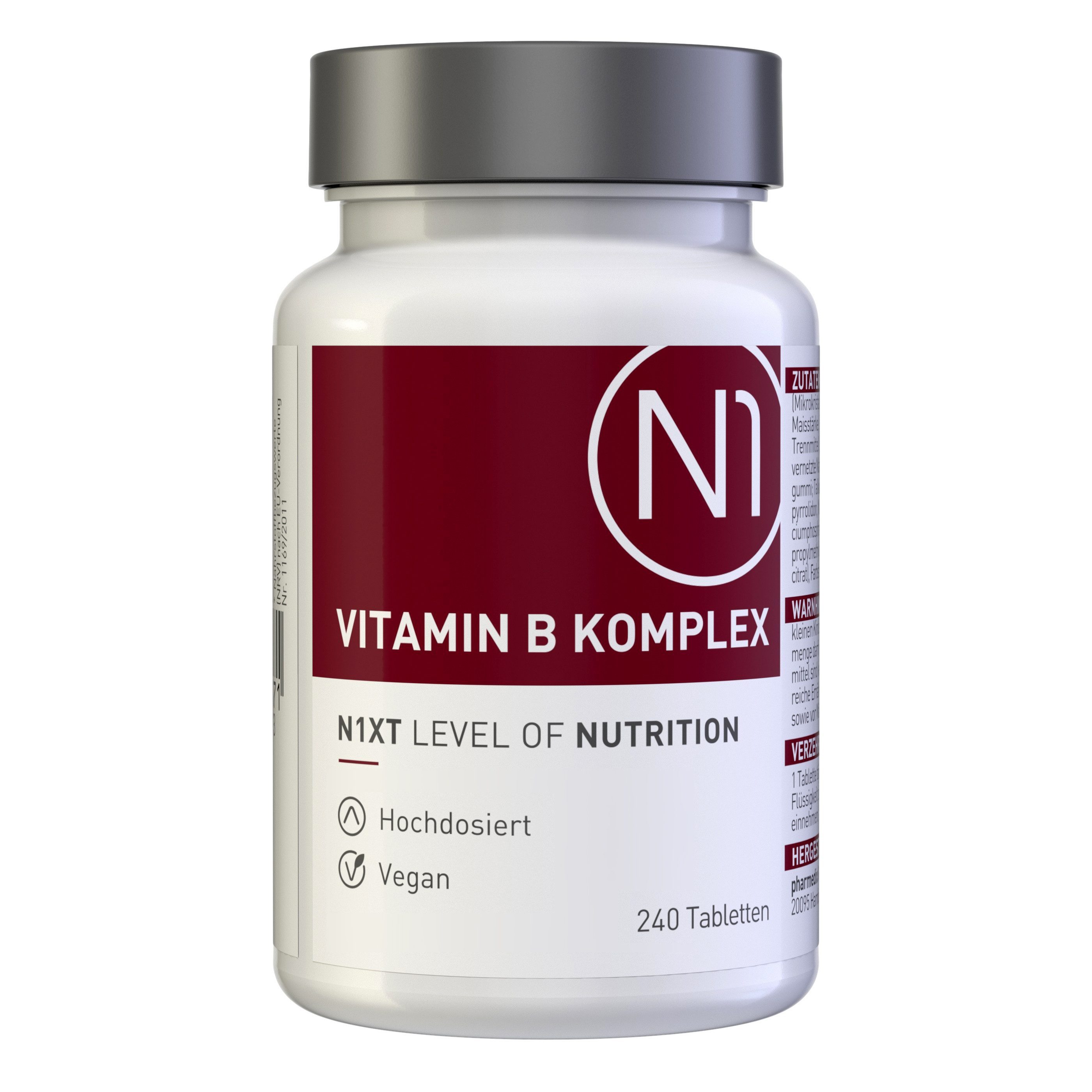 Zutaten | Füllstoff (Calciumcarbonat), Nicotinamid, Füllstoff (Mikrokristalline Cellulose), Maltodextrin, Calcium-D-pantothenat, Maisstärke, Pyridoxinhydrochlorid, Riboflavin, Thiaminmononitrat, Trennmittel (Siliciumdioxid, Magnesiumsalze der Speisefettsäuren, vernetzte Natriumcarboxymethylcellulose, modifizierter Cellulosegummi; Talkum), Pteroylmonoglutaminsäure, Füllstoff (Polyvinylpolypyrrolidon, Natrium-Carboxymethylcellulose, Cellulosegummi; Calciumphosphate), D-Biotin, Cyanocobalamin, Überzugsmittel (Hydroxypropylmethylcellulose, Polyvinylalkohol (PVA), Polydextrose, Triethylcitrat), Farbstoff (Eisenoxide, Eisenhydroxide). |
