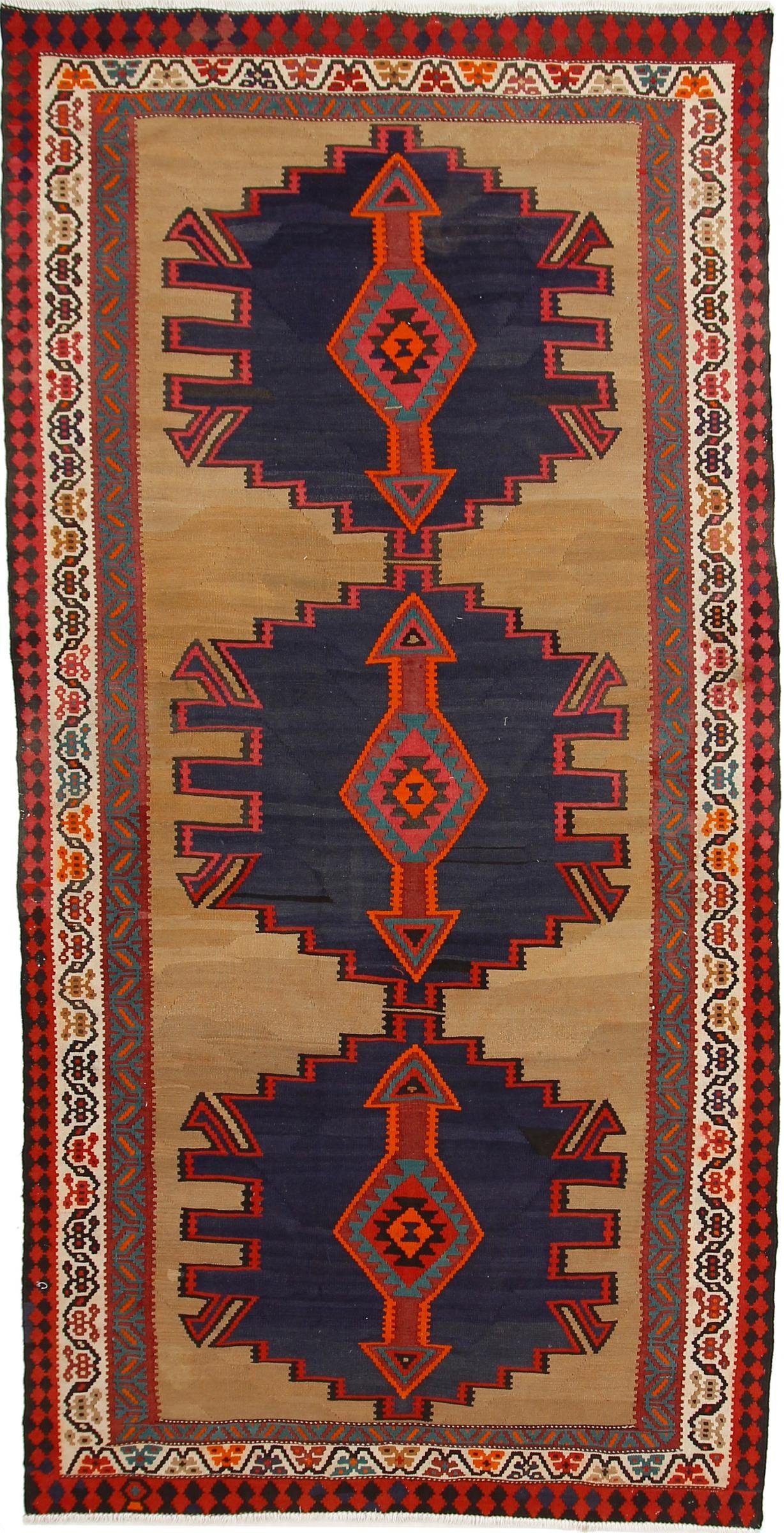 Dieser Kelim wurde von Hand aus natürlicher Wolle gewebt. Kelims erfreuten sich in den letzten Jahren großer Beliebtheit aufgrund ihrer lebendigen Farben und ihrer zeitlosen geometrischen Designs. Darüber hinaus verkörpert dieser Kelim eine jahrhundertealte Handwerkskunst. Er stammt aus dem Land Persien/Iran, das für eine lange Tradition der Teppichknüpfung und -weberei bekannt ist. Dieser Teppich wiegt nur 7.00 kg und ist damit leicht genug, um ihn schnell in einem anderen Raum zu platzieren oder ihn sogar als Decke oder Wandteppich zu verwenden. Der Ursprung dieses Teppichs wird in einem separaten Zertifikat bestätigt.