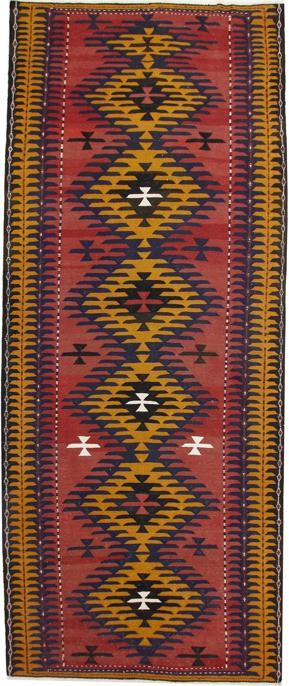 Dieser Kelim wurde von Hand aus natürlicher Wolle gewebt. Kelims erfreuten sich in den letzten Jahren großer Beliebtheit aufgrund ihrer lebendigen Farben und ihrer zeitlosen geometrischen Designs. Darüber hinaus verkörpert dieser Kelim eine jahrhundertealte Handwerkskunst. Er stammt aus dem Land Persien/Iran, das für eine lange Tradition der Teppichknüpfung und -weberei bekannt ist. Dieser Teppich wiegt nur 11.00 kg und ist damit leicht genug, um ihn schnell in einem anderen Raum zu platzieren oder ihn sogar als Decke oder Wandteppich zu verwenden. Der Ursprung dieses Teppichs wird in einem separaten Zertifikat bestätigt.