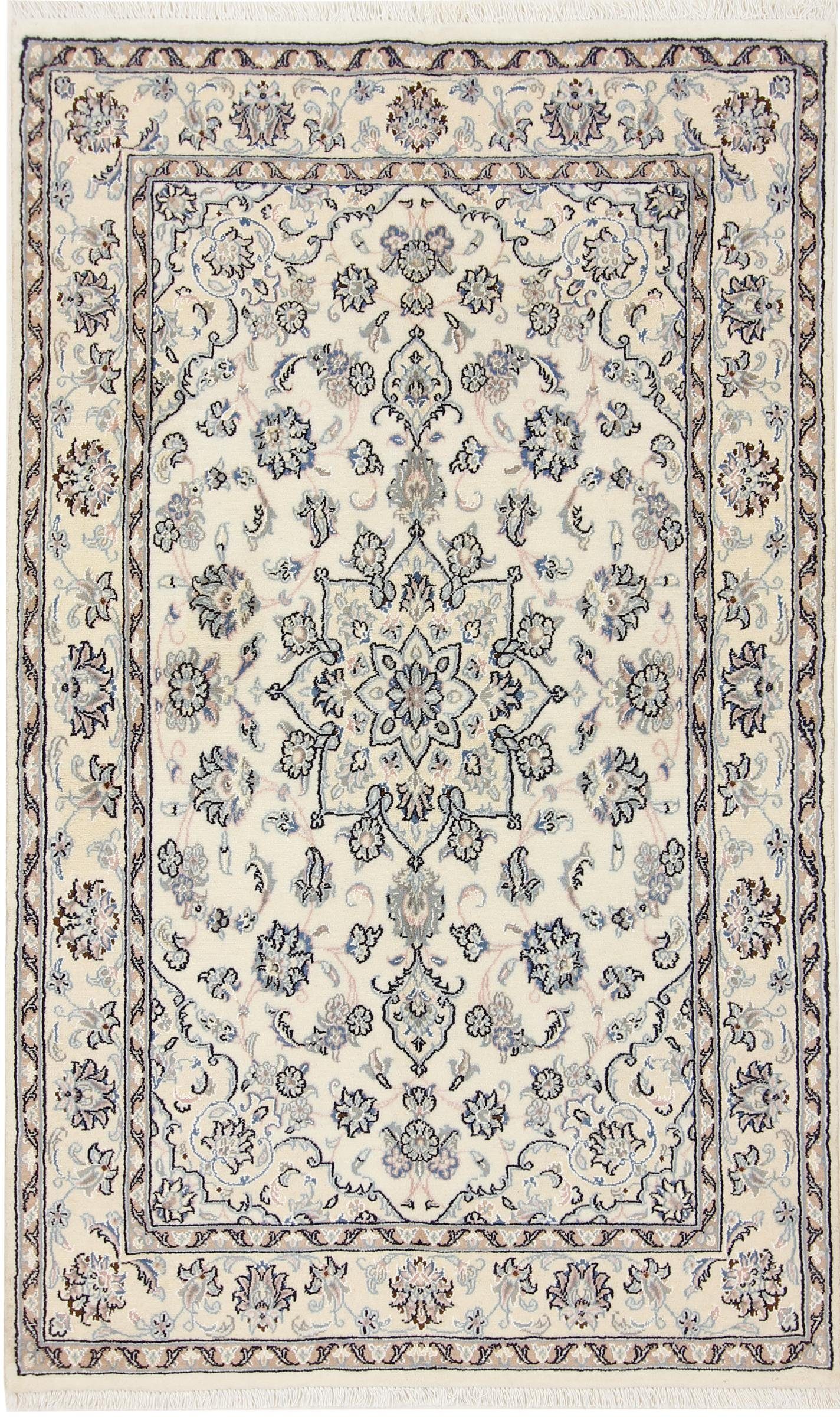 Dieser persische Nain 9La Teppich wurde von Hand geknüpft, auf die traditionellste Art und Weise, Teppiche herzustellen. Mit seiner zertifizierten Herkunft verkörpert der Nain 9La Teppich ein Höchstmaß an Kunsthandwerk und die wahrscheinlich aufwändigste Art, einen Teppich herzustellen. Es besitzt eine Dichte von 450000 / m² und ist damit ein sehr feines Kunstwerk mit einer langen Lebensdauer. Der Teppich wurde über einen Zeitraum von mehreren Monaten geknüpft und hat eine Размер von 203 mal 127. Dank der alten Handwerkskunst hat er eine Dicke von nur 8 mm, ein Indikator für hohe Qualität. Der Teppich besteht aus Wolle und wurde mit natürlichen Farbstoffen gefärbt. Dank des natürlichen Materials ist dieser Perserteppich ideal auch für Fußbodenheizungen und Kinder. Er wiegt 9.00 kg und befindet sich im perfekten Zustand. Die Herkunft des Teppichs wird von unseren Experten durch ein offizielles Zertifikat bestätigt.