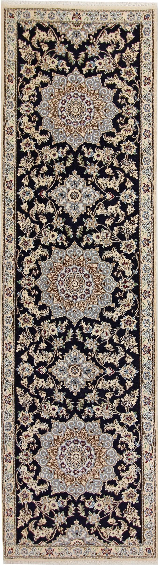 Dieser persische Nain 9La Teppich wurde von Hand geknüpft, auf die traditionellste Art und Weise, Teppiche herzustellen. Mit seiner zertifizierten Herkunft verkörpert der Nain 9La Teppich ein Höchstmaß an Kunsthandwerk und die wahrscheinlich aufwändigste Art, einen Teppich herzustellen. Es besitzt eine Dichte von 450000 / m² und ist damit ein sehr feines Kunstwerk mit einer langen Lebensdauer. Der Teppich wurde über einen Zeitraum von mehreren Monaten geknüpft und hat eine Размер von 275 mal 79. Dank der alten Handwerkskunst hat er eine Dicke von nur 8 mm, ein Indikator für hohe Qualität. Der Teppich besteht aus Wolle und wurde mit natürlichen Farbstoffen gefärbt. Dank des natürlichen Materials ist dieser Perserteppich ideal auch für Fußbodenheizungen und Kinder. Er wiegt 8.00 kg und befindet sich im perfekten Zustand. Die Herkunft des Teppichs wird von unseren Experten durch ein offizielles Zertifikat bestätigt.