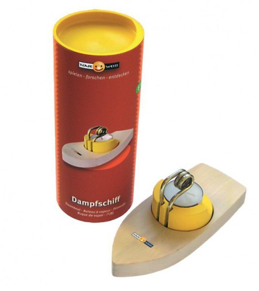 Jetzt gehen alle Kleinen auf große Fahrt! Unter die wassergefüllte Spirale des Dampfschiffes wird ein Teelicht gestellt – und schon geht es los. Und das, solange die Kerze brennt. Pulsarmotor nennt sich diese raffinierte Technik. Durch Drehen des gelben Aufbaus lässt sich die Fahrtrichtung bestimmen. So haben alle Spaß beim ungefährlichen Einsatz in der Badewanne oder in anderen ruhigen Gewässern.
