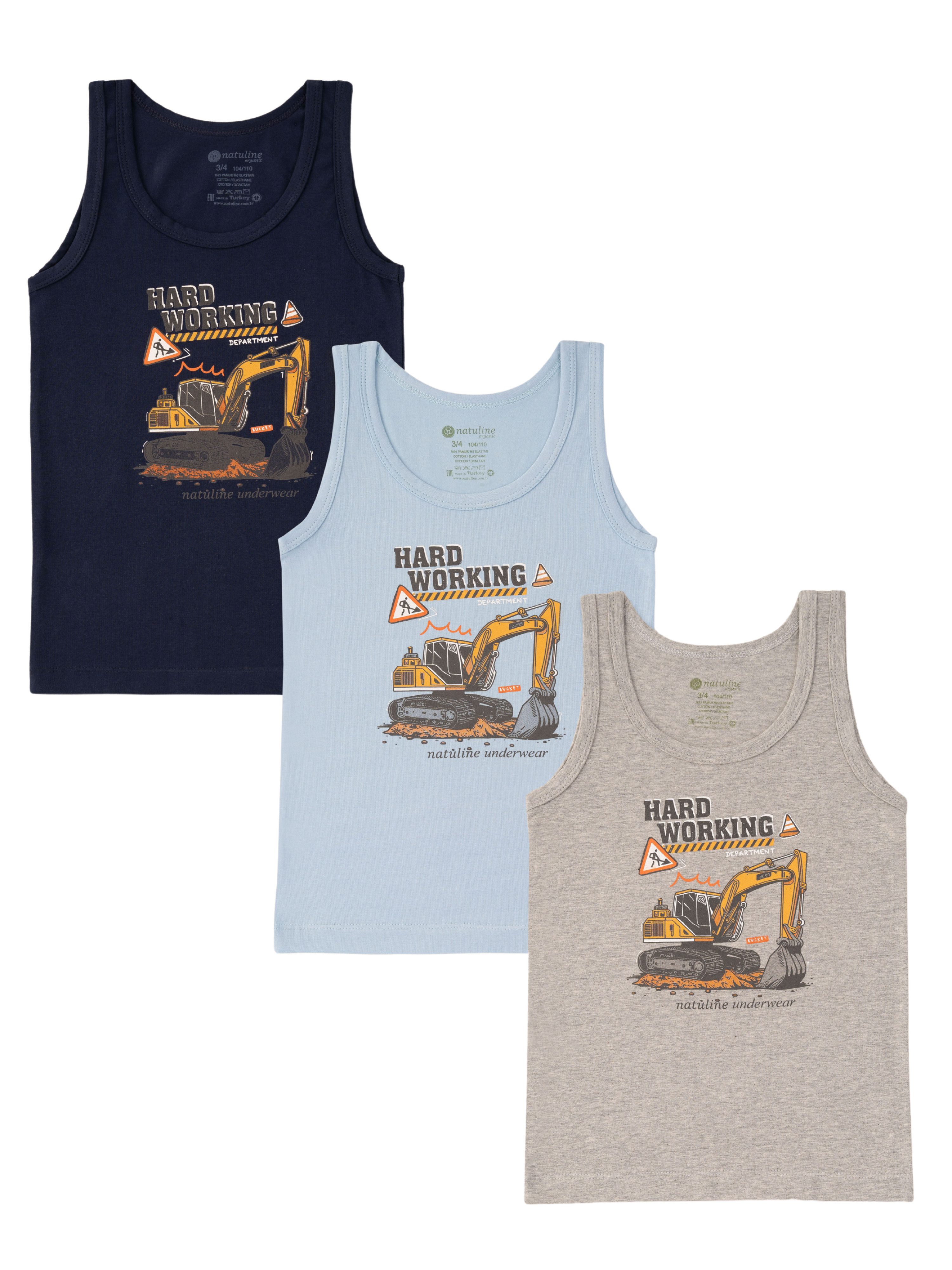 Das 3er-Pack Achselshirts von natuline für Jungen im Alter von 3 bis 10 Jahren kombiniert kindgerechtes Design mit höchstem Tragekomfort und Funktionalität. Gefertigt im nahtlosen Rundstrickverfahren, bieten diese Unterhemden eine besonders angenehme Passform ohne störende Seitennähte. Aus 95% Baumwolle und 5% Elasthan Anteil in Feinripp-Qualität gefertigt, sind sie hautfreundlich, atmungsaktiv und ideal für empfindliche Kinderhaut. Die fröhlichen Bagger-Motive mit dem Schriftzug „HARD WORKING“ machen die Shirts zu einem echten Hingucker für kleine Baustellen-Fans. In den Farben Dunkelblau, Hellblau und Grau erhältlich, sind sie sowohl als Unterwäsche als auch als luftiges Sommer-Top tragbar. Dank der temperaturausgleichenden Eigenschaften eignen sich die Achselshirts für jede Jahreszeit. Erhältlich in den Größen 104 bis 146, überzeugt dieses Set durch Langlebigkeit, Qualität und ein liebevoll gestaltetes Design.