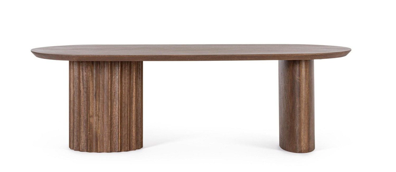 Dieser Couchtisch verbindet natürliche Materialien mit feiner Handwerkskunst und moderner Formensprache. Mit seiner warmen Ausstrahlung, der harmonischen Farbgebung und der liebevoll gestalteten Detailarbeit wird er zum stilvollen Mittelpunkt im Wohnzimmer – ein Möbelstück, das nicht nur durch Funktion überzeugt, sondern durch seine Präsenz den Raum bereichert. Die Tischplatte besteht aus Mangoholz, einem robusten und langlebigen Naturmaterial mit ausdrucksstarker Maserung. Das natürliche Finish hebt die individuelle Struktur des Holzes besonders schön hervor – jede Platte ist ein Unikat mit feinen Nuancen in Farbe und Textur. Für zusätzlichen Schutz sorgt eine hochwertige Beschichtung auf Nitrocellulose-Basis. Diese veredelt die Oberfläche mit einem seidenmatten Glanz, ohne den natürlichen Charakter des Holzes zu überdecken, und macht sie gleichzeitig widerstandsfähiger gegen Kratzer, Feuchtigkeit und alltägliche Nutzung. Ein besonderes Designhighlight sind die Tischfüße mit gerilltem Holzprofil. Auch sie bestehen aus Holz und sind mit einem warmen braunen Finish versehen, das perfekt mit der Tischplatte harmoniert. Die senkrecht verlaufenden Rillen bringen Tiefe, Struktur und eine subtile Dynamik in das Gesamtbild. Durch diese besondere Gestaltung erhalten die Füße einen fast skulpturalen Charakter und verleihen dem Tisch eine moderne, aber dennoch wohnliche Ästhetik. Mit einer Длина von etwa 130 Zentimetern, einer Breite von 65 Zentimetern und einer Höhe von 40 Zentimetern bietet der Couchtisch großzügige Ablagefläche für Bücher, Tabletts, dekorative Objekte oder den gemütlichen Kaffeegenuss. Durch seine niedrige Bauweise und die ausgewogenen Proportionen fügt er sich ideal in verschiedenste Einrichtungsstile ein – ob natürlich, skandinavisch, modern oder boho-inspiriert.