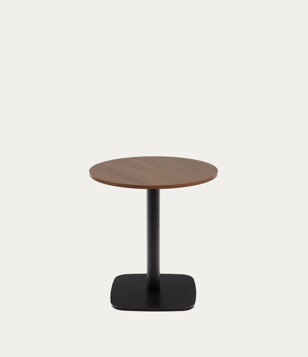 Robust und standfest. Aufgrund der Materialien überzeugt der Tisch mit Langlebigkeit. Die runde nussbaumoptische Tischplatte ist aus einer 19 mm starken Melaminplatte. In Kombination mit den Tischbeinen, die aus Eisen mit mattschwarzer Sprühlackierung sind, bringen sie einen natürlichen Look in Ihren Innenbereich. Der Tisch ist sehr pflegeleicht, da er bei Bedarf einfach mit einem feuchten Tuch und mildem Reinigungsmittel gereinigt werden kann. Aufgrund der Farbkombination passt sich der Tisch jeder Stilrichtung an. Zudem bietet der Tisch Platz für bis zu 4 Personen. Die Pulverbeschichtung schützt das Material vor Witterungseinflüssen.