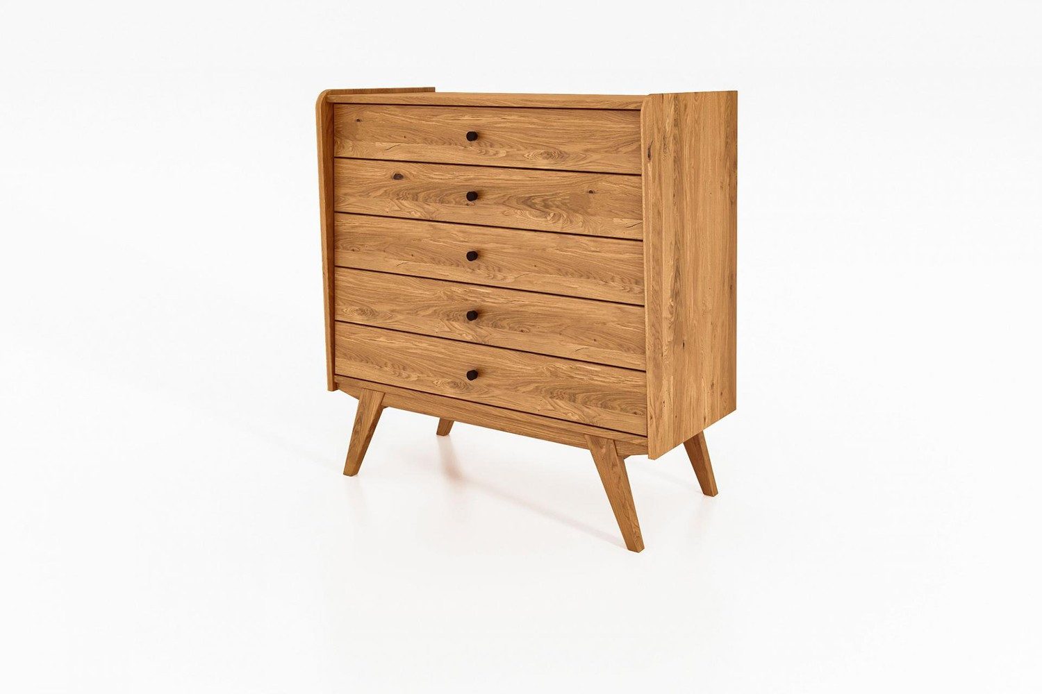 Sie möchten eine massive Kommode welche durch ihre Optik und Robustheit besticht ? Dann kann diese Kommode genau die Richtige für Sie sein. Sie ist aus massiver geölter Wildeiche gefertigt, hat fünf große Schubladen mit Softclose und Griffe aus Aluminium in Schwarz. Die Schubladen sind mit schwarzem Samt ausgelegt. Sie steht auf vier stabilen massiven schrägen Holzbeinen. Die Kommode bietet genug Stauraum für alle möglichen Dinge und oben auch Platz für Deko. Auf jeden Fall ein Highlight für jedes Schlafzimmer oder Wohnzimmer.