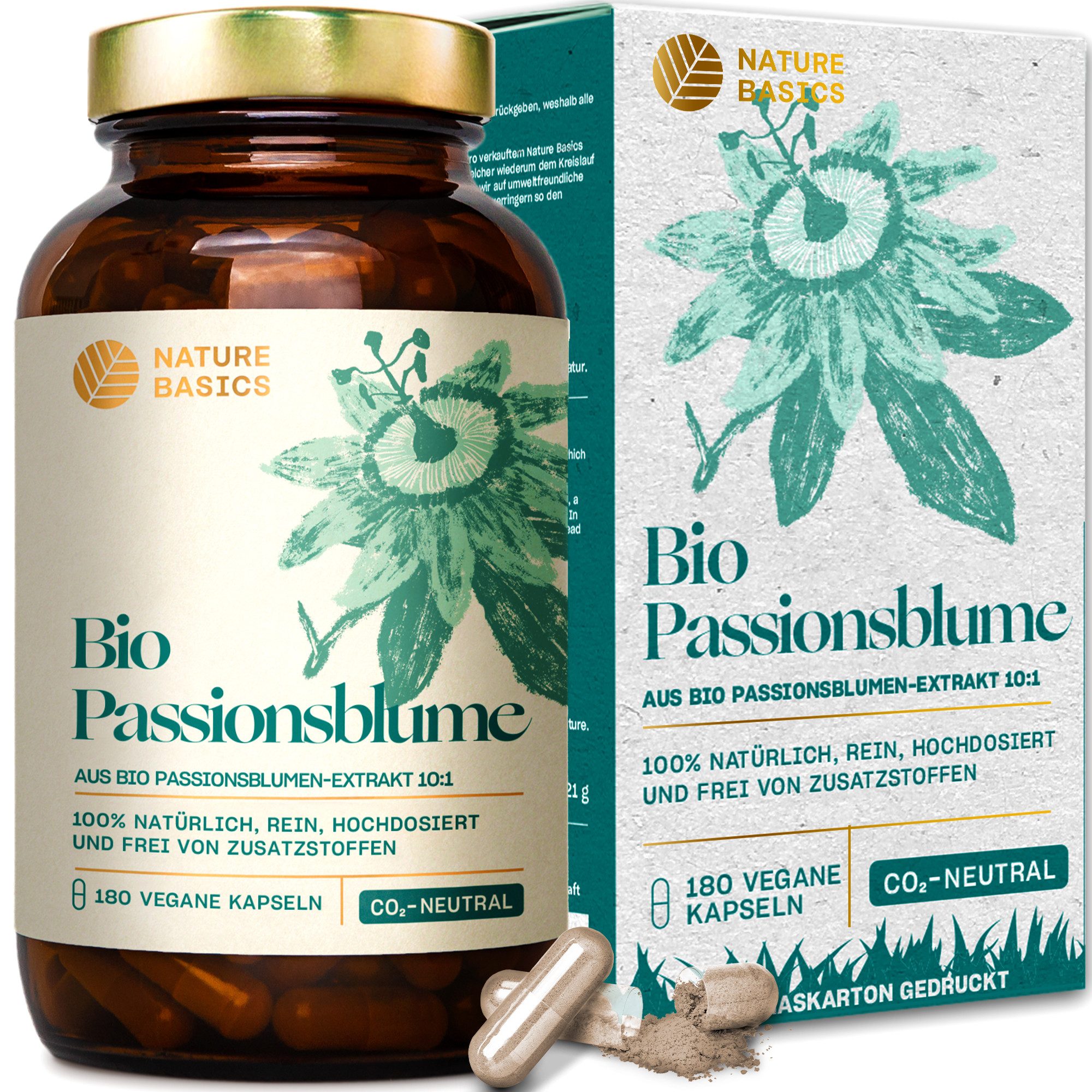 180 Kapseln mit hochdosiertem 550mg Bio Passionsblumen Extrakt pro Tagesdosis (2 Kapseln) für eine optimale Bioverfügbarkeit. Wir von Nature Basics empfehlen 2 natürliche Passionsblumen Kapseln pro Tag.