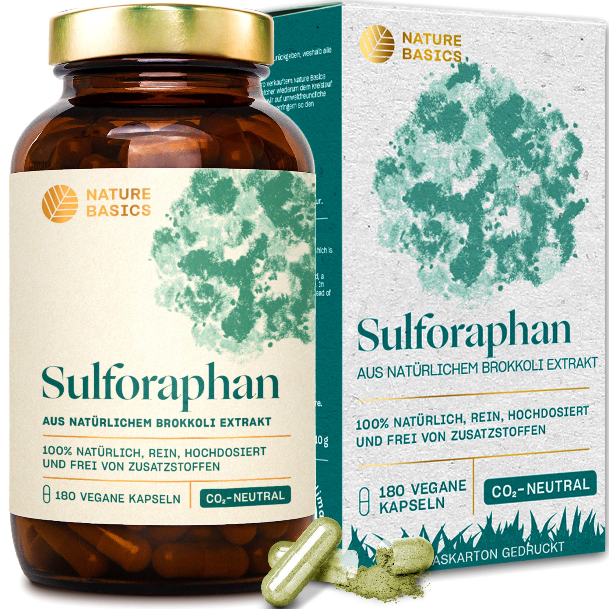 Vegane Kapseln mit hochdosiertem 500 mg Brokkoli Extrakt pro Tagesdosis (1 Kapsel), davon sind 10 % Sulforaphane. Wir von Nature Basics empfehlen 1 natürliche Sulforaphan Kapsel pro Tag.