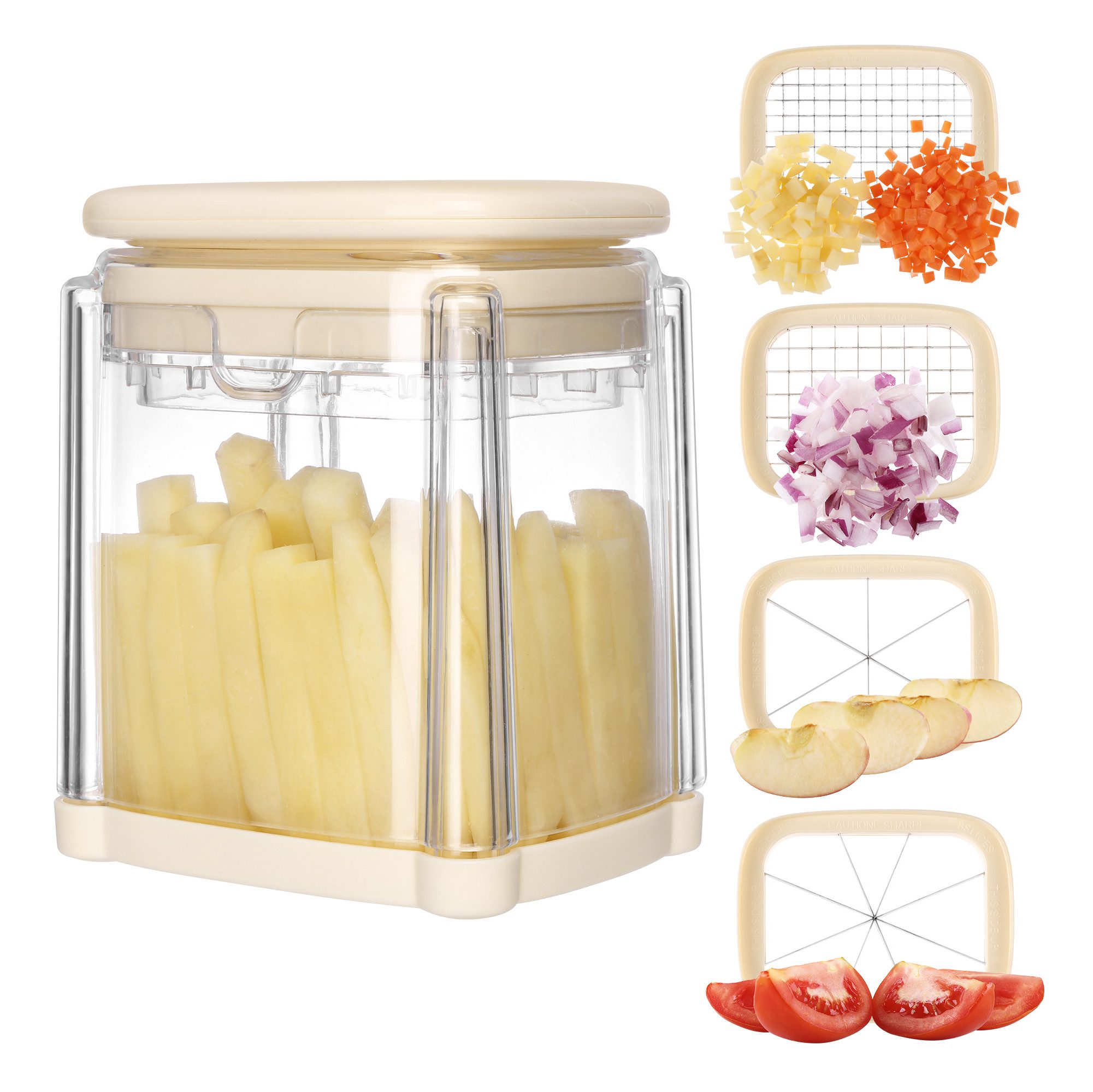 Vielseitige Klingenoptionen: Mit diesem Kartoffelschneider kannst du Pommes Frites und Kartoffelecken in verschiedenen Formen und Größen herstellen.