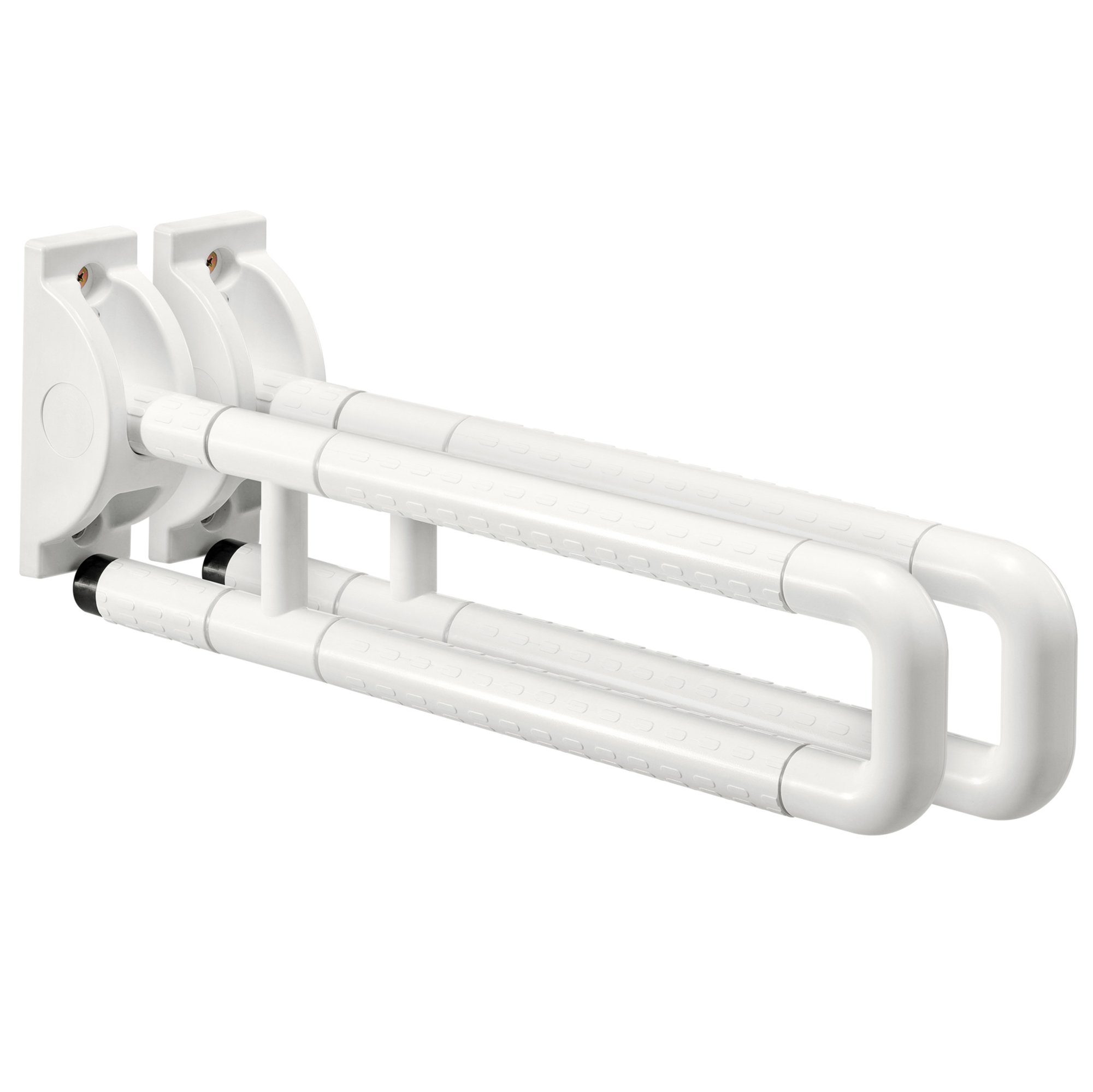 Platzsparender Komfort: Spare Platz in deinem Badezimmer mit unseren klappbaren und schwenkbaren Stützgriffen, die flach an der Wand liegen, wenn du sie nicht benutzt.