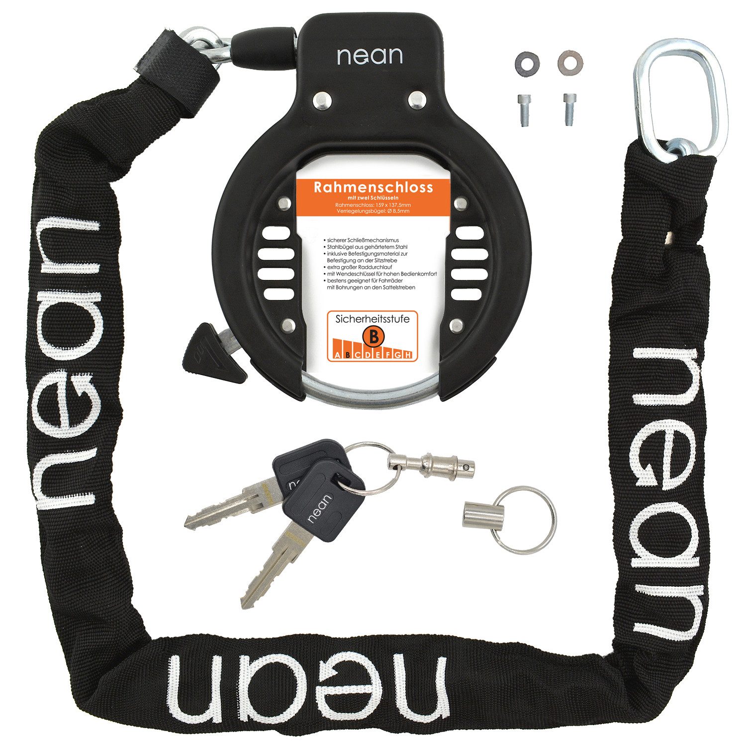 Lieferumfang | 1 Rahmenschloss 1 Stahlkette 2 Schrauben mit Scheibe 1 Bedienungsanleitung 2 Schlüssel 1 Schlüsselanhänger |