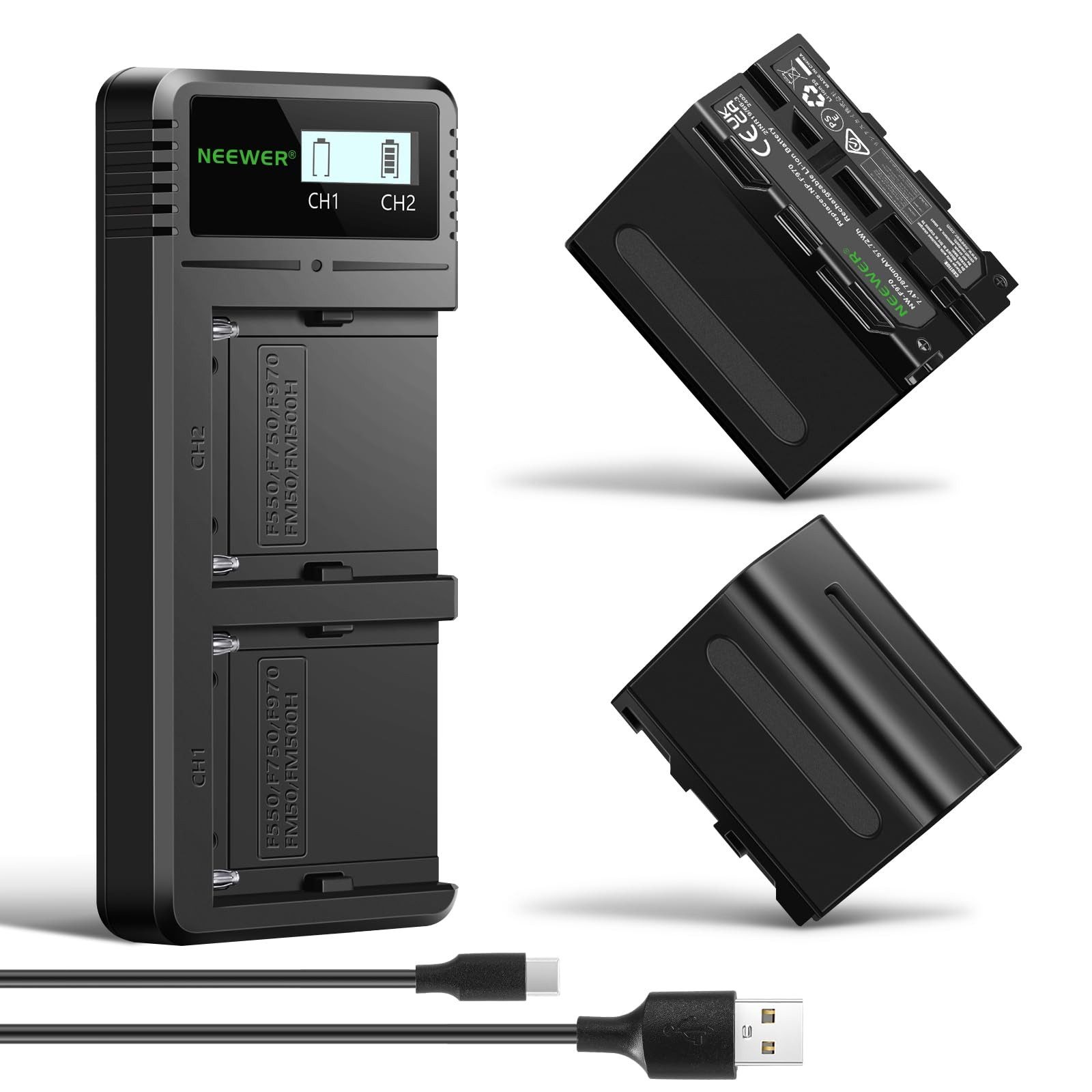 Das NEEWER Schnellladegerät ist kompatibel mit Sony NP-F550 NP-F570 NP-F750 NP-F770 NP-F960 NP-F970 NP-F975 Akkus und verfügt über Micro USB und USB C Eingangsanschlüsse zum Zweikanaligem Laden. Der USB C Anschluss unterstützt das Schnellladen, wobei ein QC 2.0/3.0 Ladegerät zum Laden eines NP-F970 Akkus mit einem Strom von 1,5A oder zwei NP-F970 Akkus mit einem Strom von 1A verwendet werden kann. Das Set enthält außerdem zwei Ersatzbatterien NP-F970 mit 7,800mAh, die ausreichend und konstante Energie für längere Aufnahmesitzungen bieten. Mit dem Ladegerät können beide Akkus gleichzeitig geladen werden.