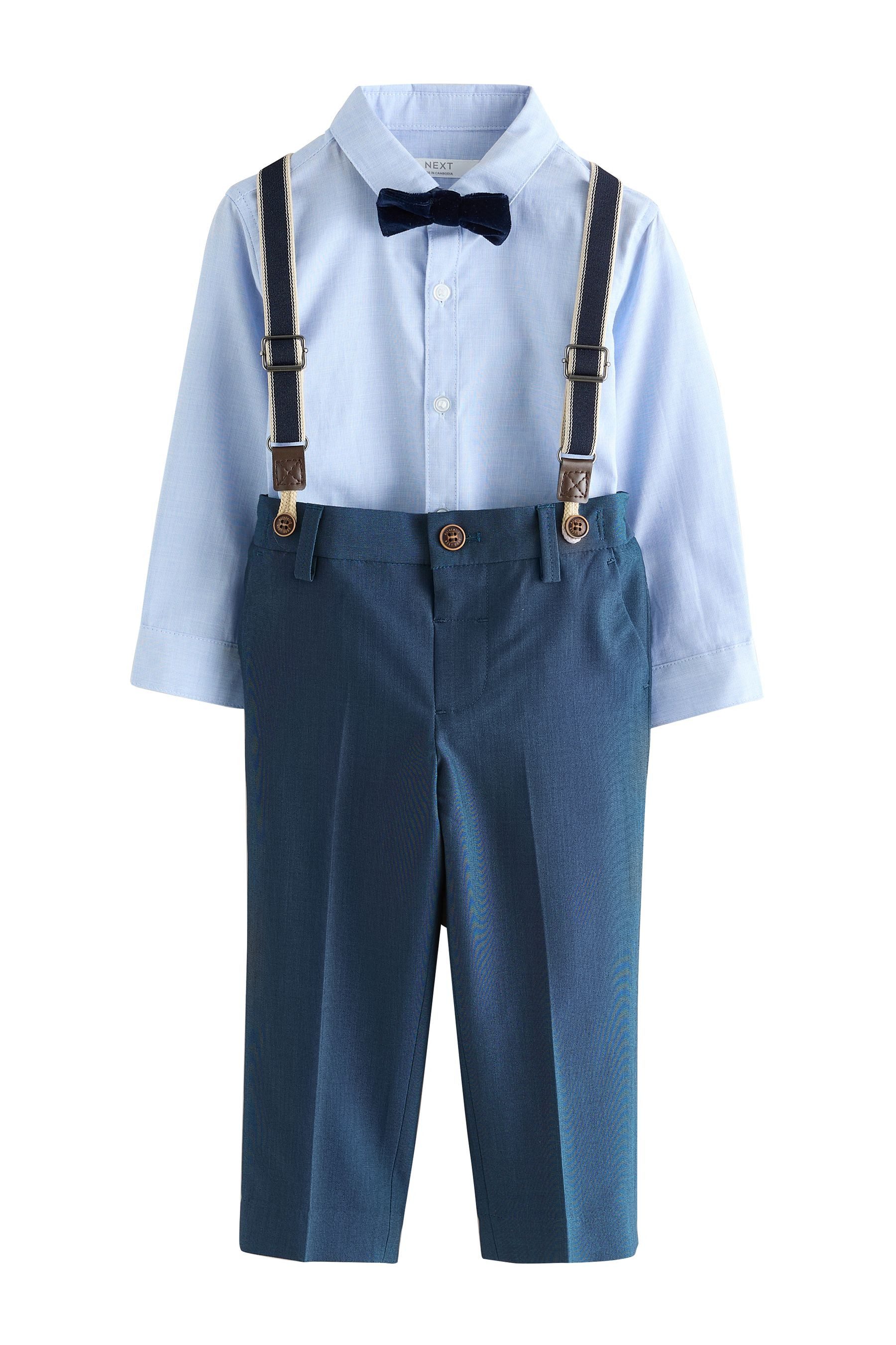 Materialzusammensetzung | Hemd: 100 % Baumwolle. Hose: 69 % Polyester, 25 % Viskose, 6 % Elasthan. Fliege: 100 % Polyester. Hosenträger: 87 % Polyester, 13 % Elasthan. |