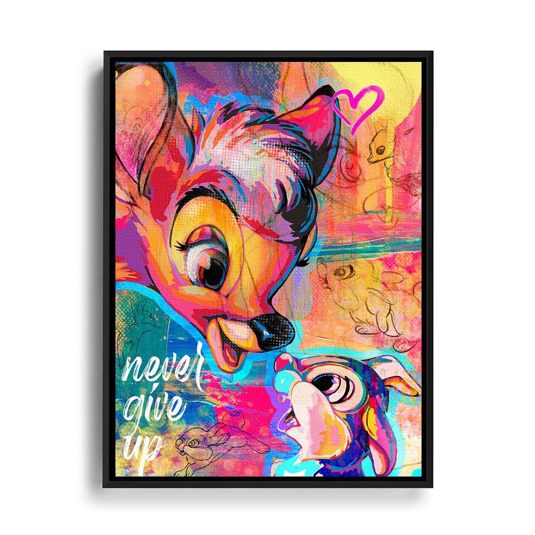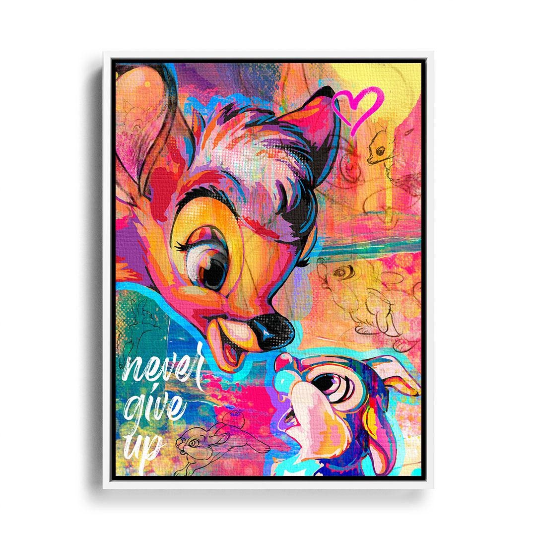 Bambi Never Give Up – Wandbild auf Leinwand & Acrylglas Dieses Wandbild strahlt Motivation und Lebensfreude aus. Die farbenfrohe Darstellung von Bambi und Klopfer kombiniert mit der Botschaft „Never Give Up“ schafft eine positive und inspirierende Atmosphäre. Perfekt für Räume, die Kreativität und Optimismus ausstrahlen sollen. Kunst, die inspiriert: Eine verspielte Mischung aus Farben und einer motivierenden Botschaft, die begeistert.