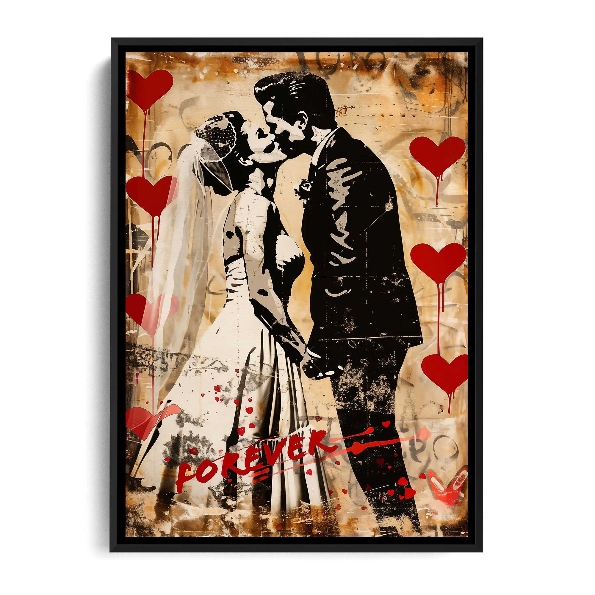Banksy Wedding – Wandbilder modern | Leinwand & Acrylglas Dieses romantische Wandbild zeigt ein stilisiertes Hochzeitspaar im Banksy-Stil, umgeben von leuchtenden Herzen. Die warmen Farben und die dynamische Graffiti-Optik verleihen dem Motiv eine urbane und zugleich emotionale Ausstrahlung. Perfekt für moderne Wohnräume oder als besonderes Hochzeitsgeschenk. Kunst, die berührt: Banksy-inspirierte Street-Art mit romantischem Flair.