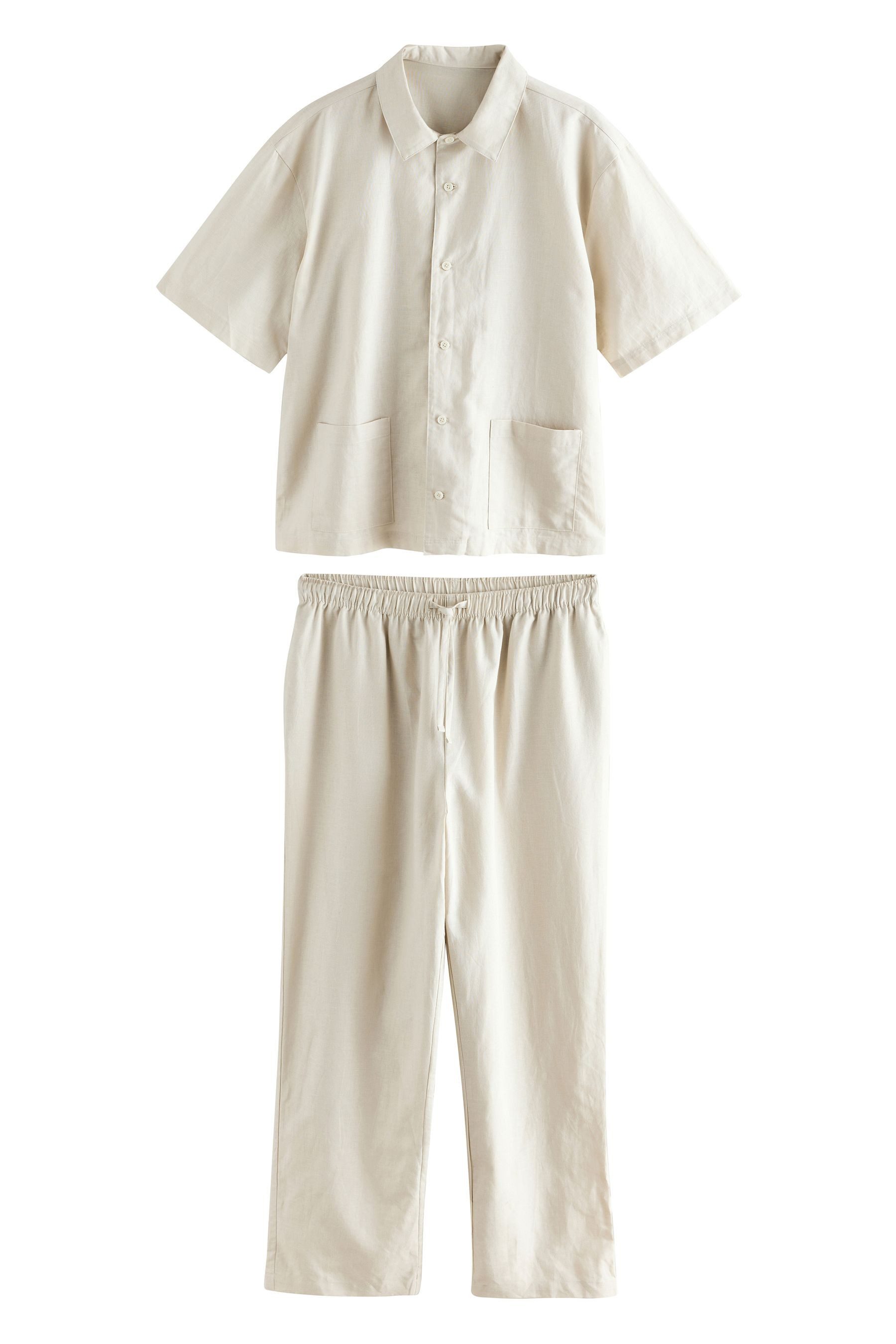 Materialzusammensetzung | Oberteil: 54 % Leinen, 46 % Baumwolle. Hose: 54 % Leinen, 46 % Baumwolle. |