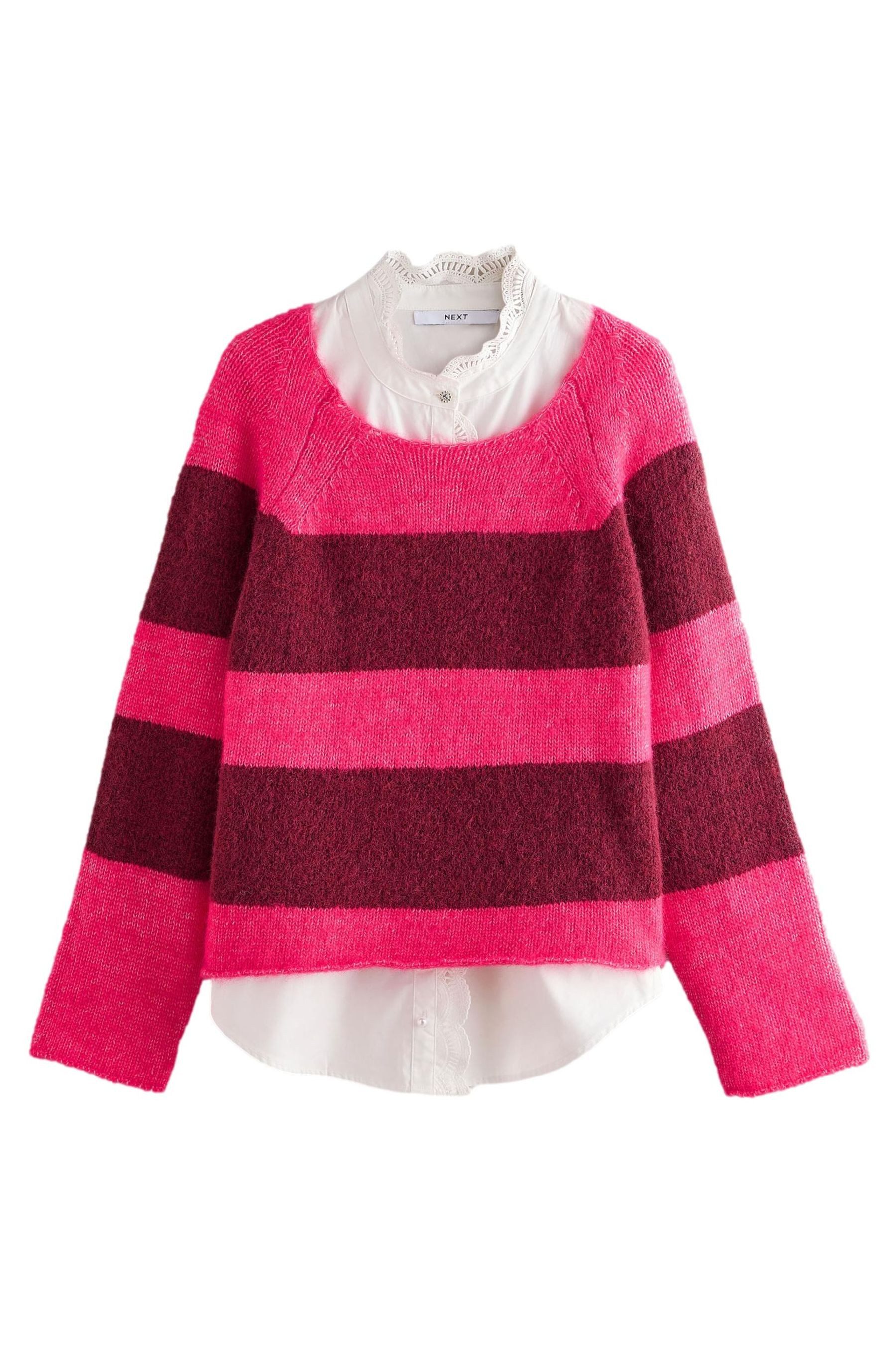 Materialzusammensetzung | Pullover: 83 % Polyester (recycelt), 11 % Polyamid, 6 % Wolle. Hemd: 100 % Baumwolle. |