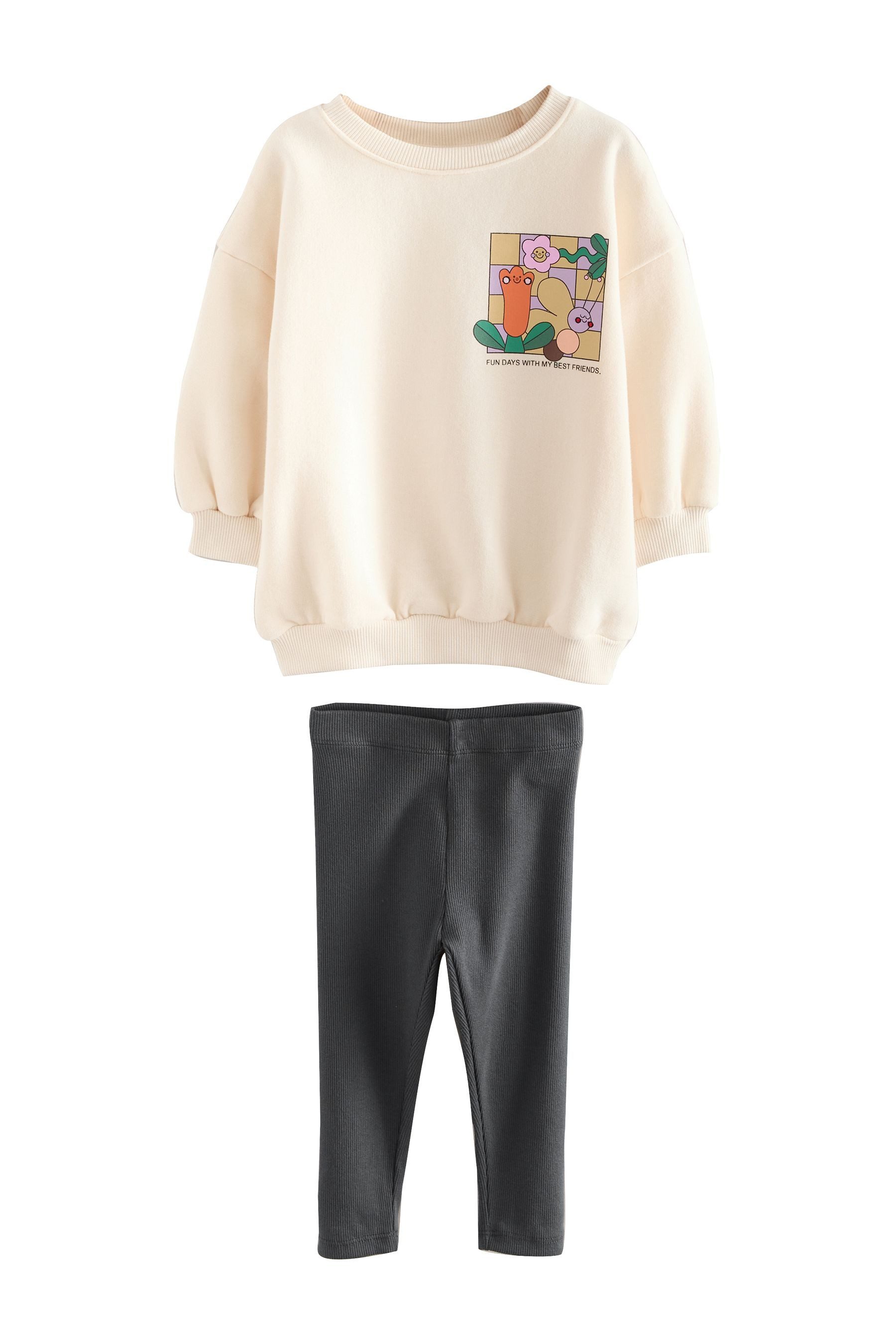 Materialzusammensetzung | Sweatshirt: 85 % Baumwolle, 15 % Polyester (recycelt). Leggings: 94 % Baumwolle, 6 % Elasthan. |
