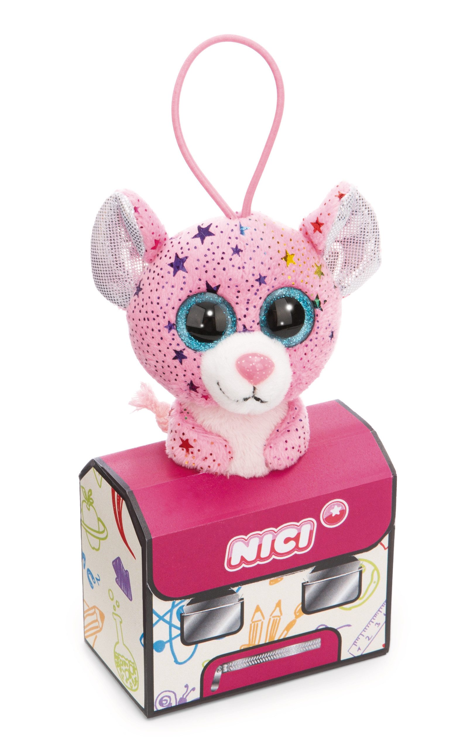 LIEFERUMFANG - Glubschis in einem Schulranzen, 1 Plüschfigur Classic Maus Miss Mausie (rosa) in einem lila weißen Schulranzen.