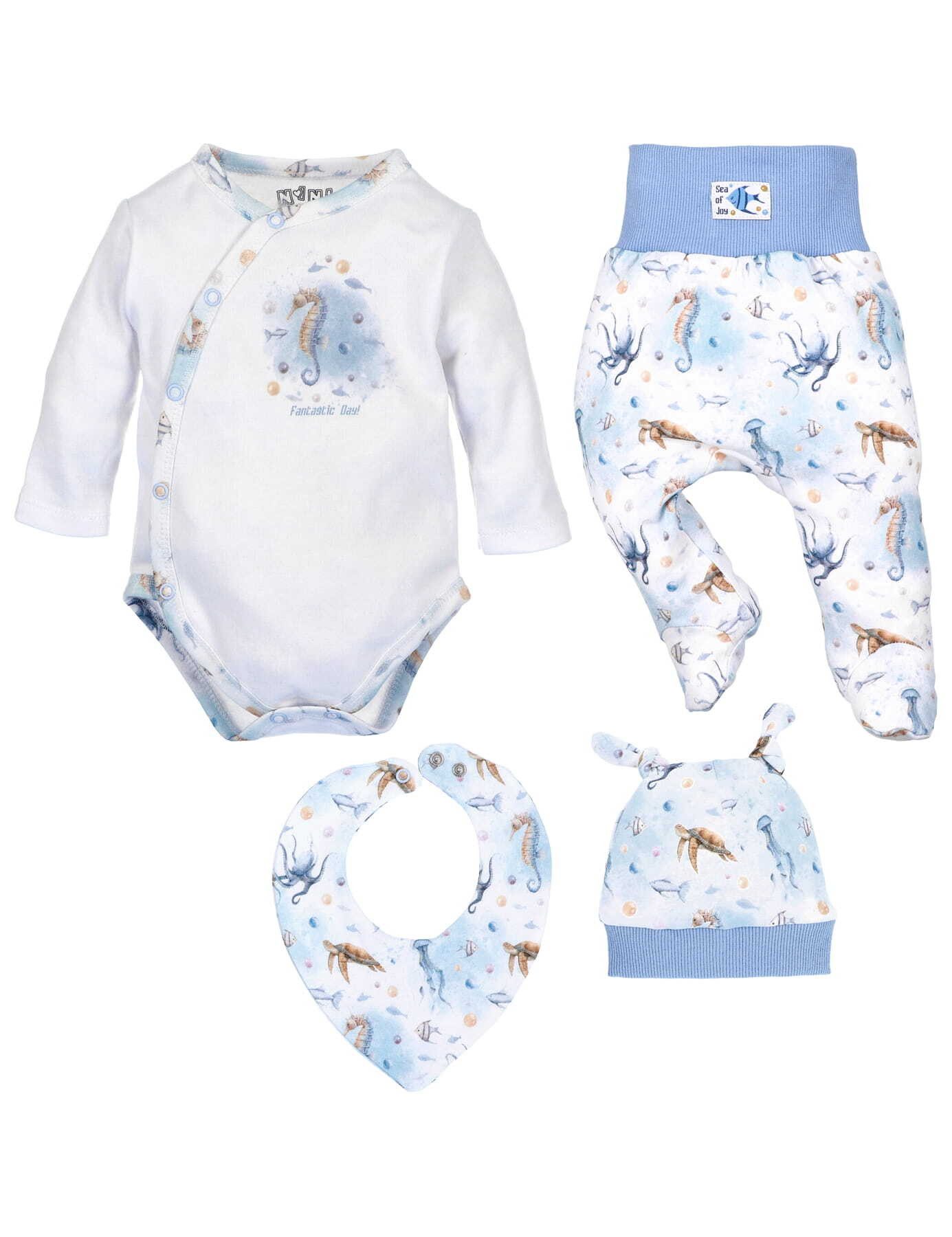 Dieses bezaubernde Set bestehend aus Wickelbody, Hose, Mütze und Halstuch bringt die Wunder der Meere direkt in den Kleiderschrank. Mit detailverliebten Prints von Schildkröten, Quallen, Seepferdchen und Oktopussen in sanften Aquarelltönen ist das Set ein echtes Highlight für kleine Meeresfans. Ob beim Krabbeln, Stramplen oder Kuscheln – dieses Set aus weichem Baumwollstoff liegt angenehm auf der Haut und macht alles mit! Der Body verfügt über praktische Druckknöpfe auf der Vorderseite und im Schritt, was das An- und Ausziehen sowie das Wickeln erleichtert. Die Hose mit extra breitem, elastischem Bauchbund passt sich sanft dem Babybäuchlein an und bietet genug Bewegungsfreiheit. Die doppelt geknotete Mütze hält das Köpfchen warm und sieht dabei besonders süß aus. Abgerundet wird das Set durch das Dreieckstuch mit Druckknopf, das als Sabber- oder Halstuch einsetzbar ist – ideal bei Zahnungsphasen. (C01880-001)