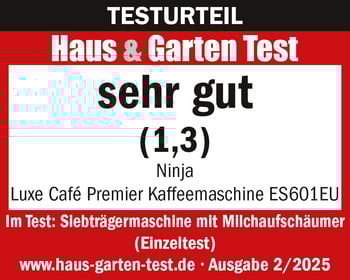 Die Ninja Luxe Cafe ES601EU erzielt im Einzeltest des Magazins „Haus & Garten Test“ das Gesamtergebnis „sehr gut (1,3)“. Die Funktion ist „sehr gut“: Sowohl die Kaffee- als auch die Milchschaumzubereitung gelingen „sehr gut“. Der Ausguss ist „sehr gut“ und das Gerät ist leicht zu bedienen sowie sehr einfach zu reinigen. Es ist hochwertig verarbeitet. Die Ökologie ist „sehr gut“. Außerdem punktet die sehr hohe Sicherheit. Insgesamt liefert das Modell „Kaffeegenuss pur“ und „Milchschaum der Extraklasse“.
