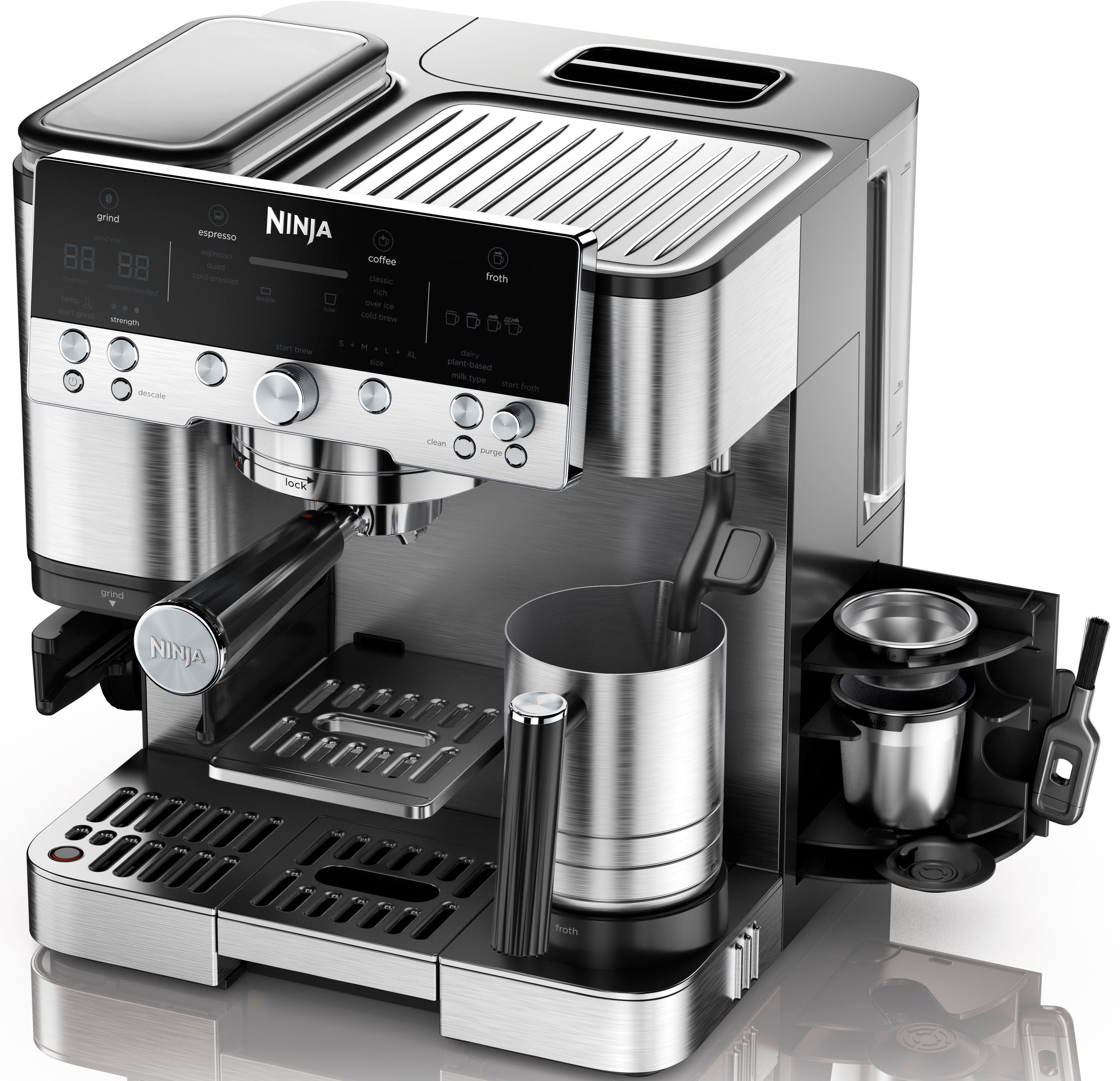 Впередe VorteileBereiten Sie mit der vielseitigen 3-in-1 Espresso-, schnellen Cold Brew- und Kaffeemaschine von Ninja ganz einfach Getränke in Café-Qualität zu. Von manuellen Mahleinstellungen bis zu automatischen Aufschäumfunktionen – kreieren Sie Kaffeegetränke ganz nach Ihrem Geschmack. Das integrierte Kaffeemahlwerk und der mitgelieferte praktische Tamper machen diese Kaffeemaschine zu einem wahren Wunderwerk.