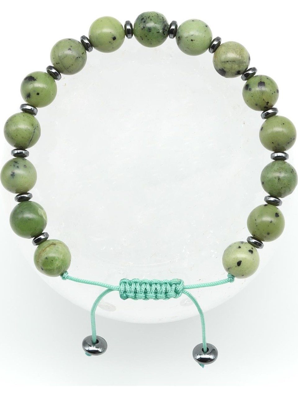 Makramee-Armband aus echten Kanada-Jade-Steinen, bekannt für ihre natürliche Schönheit und individuelle Maserung.