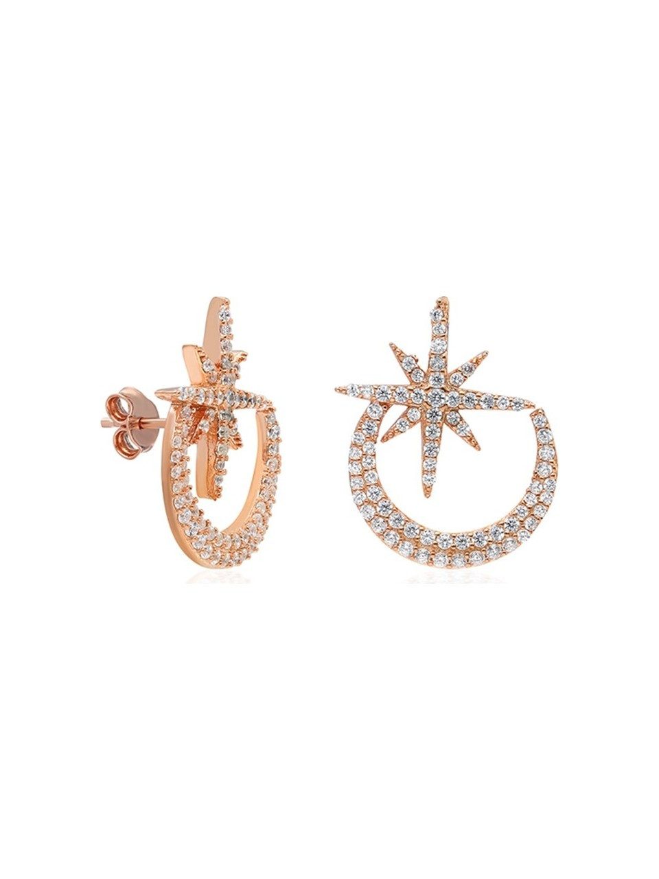 Diese luxuriösen Ohrringe aus 925 Sterling Silber sind ein wahrer Blickfang. Das Design zeigt ein stilvolles Halbmond- und Sternmotiv, das vollständig mit funkelnden Zirkonia-Steinen besetzt ist. Die Rosévergoldung verleiht den Ohrringen eine moderne Eleganz, während das Funkeln der Steine für Glamour sorgt. Perfekt für festliche Anlässe, Abendgarderobe oder als besonderes Geschenk für einen geliebten Menschen.