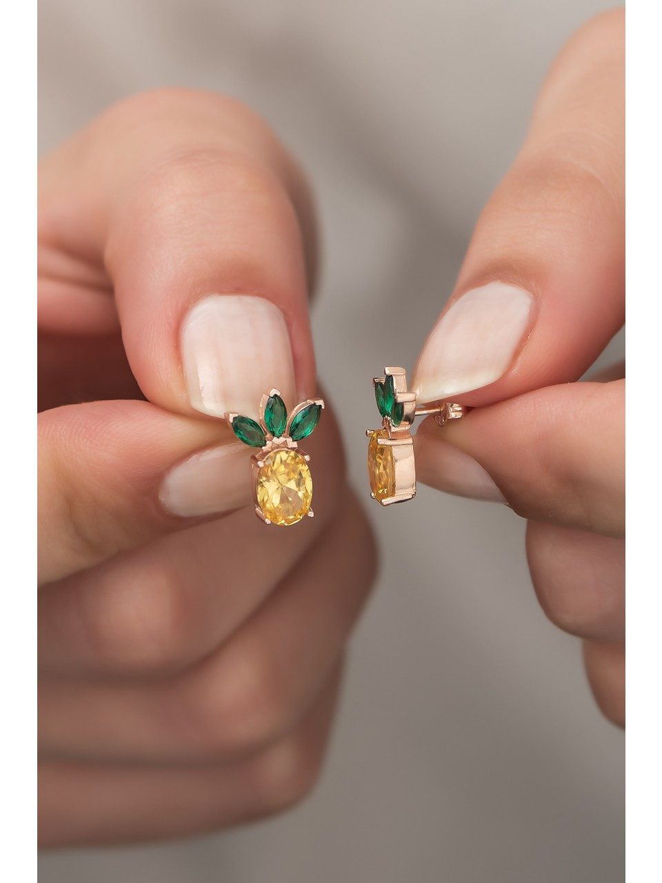 Diese außergewöhnlichen Damenohrringe aus 925er Sterling Silber bringen mit ihrem charmanten Ananas-Design sommerliche Leichtigkeit in jedes Outfit. Der leuchtend gelbe Citrin-Stein bildet das Herzstück, während die grünen Zirkonia-Blätter das Design abrunden und für einen frischen, tropischen Look sorgen. Durch die Rosévergoldung entsteht ein warmer Schimmer, der den lebendigen Farben zusätzliche Strahlkraft verleiht. Mit ihrer verspielten Eleganz sind diese Ohrringe die perfekte Wahl für Frauen, die Schmuckstücke mit besonderem Charakter lieben.