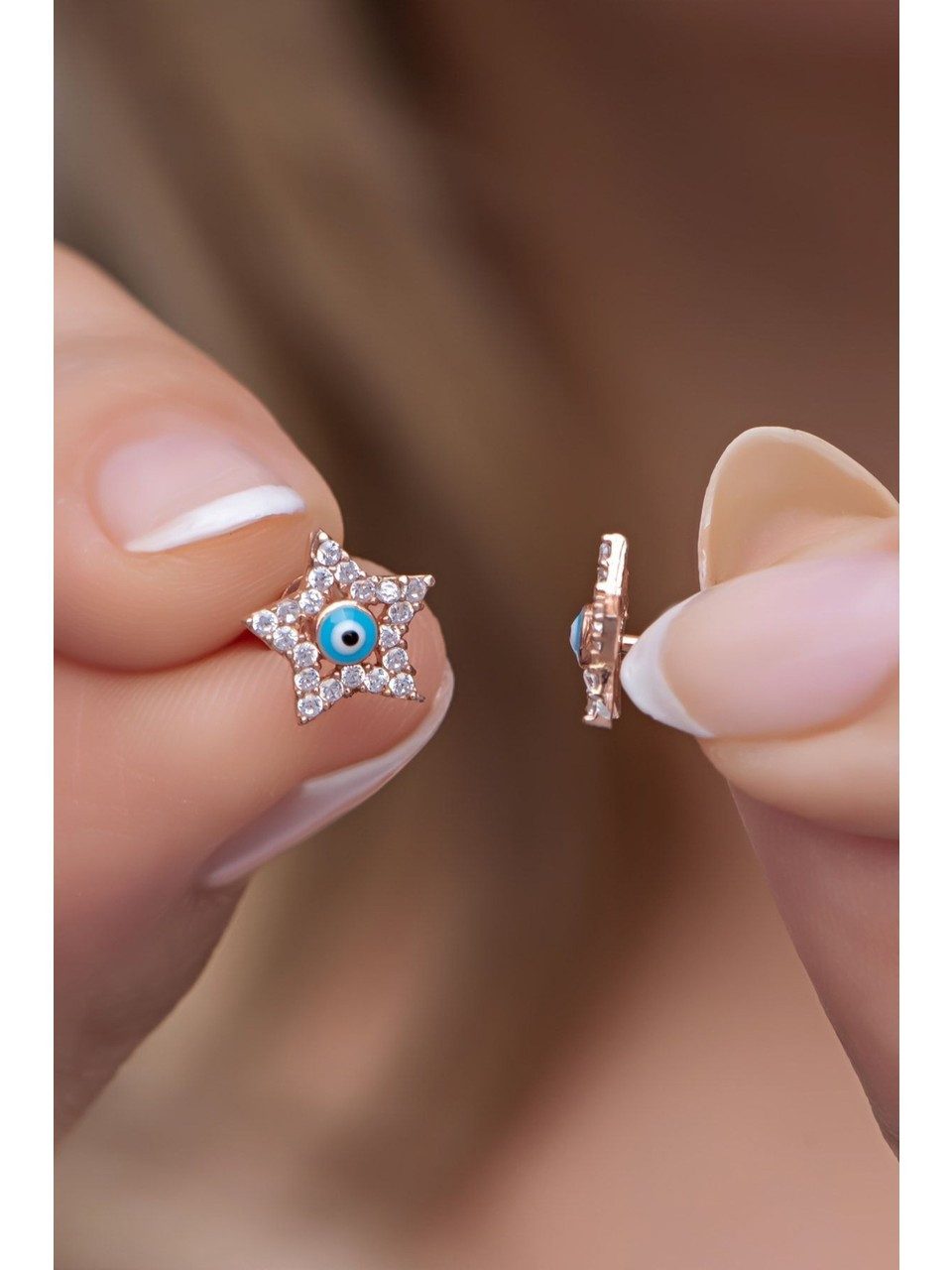 Diese feinen Ohrstecker aus 925 Sterling Silber mit Rosévergoldung verbinden das schützende Nazar-Auge mit einem funkelnden Sternmotiv. Umrahmt von glitzernden Zirkonia-Steinen, vereinen sie symbolische Bedeutung mit moderner Eleganz. Das Design steht für Schutz, Energie und positive Ausstrahlung – ein einzigartiger Begleiter für den Alltag und für besondere Anlässe. Mit ihrem leichten Gewicht und der kompakten Размер sind die Ohrstecker angenehm zu tragen und unterstreichen dezent die persönliche Note jeder Frau.