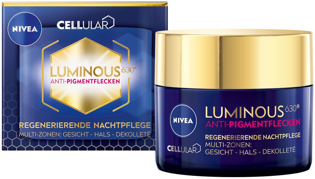 Nivea Nachtcreme LUMINOUS630 ANTI-PIGMENTFLECKEN Regenerierende Nachtpflege, Beugt Neuentstehung vor, spendet Feuchtigkeit, mit Hyaluronsäure.