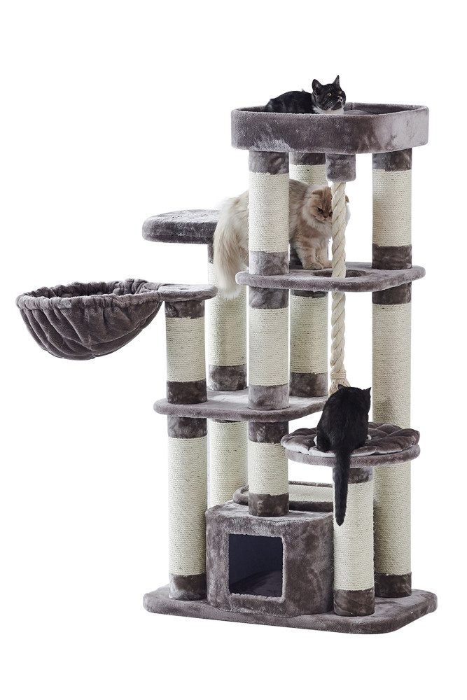 Der Nobby Kratzbaum "Fredo" sorgt für vielseitige Spiel- und Schlafmöglichkeiten, eben alles, was ein Katzenherz begehrt. Eine kuschelige Liegemulde, Platten mit Kissen und eine Höhle bieten einen gemütlichen Rückzugsort für Ihre Katze. Ein extra langes Spielseil, Sisalstämme und -platten sorgen für spielerische Abwechslung und die nötige Krallenpflege. Durch die große Bodenplatte mit den Maßen 85 x 50 cm und die breiten Sisalstämme mit einem Durchmesser von 12 cm wird ein stabiler Stand gesichert. Damit können sich ebenso größere Katzen auf dem Kratzbaum rekeln und wohlfühlen. Er hat eine Gesamthöhe von 158 cm.