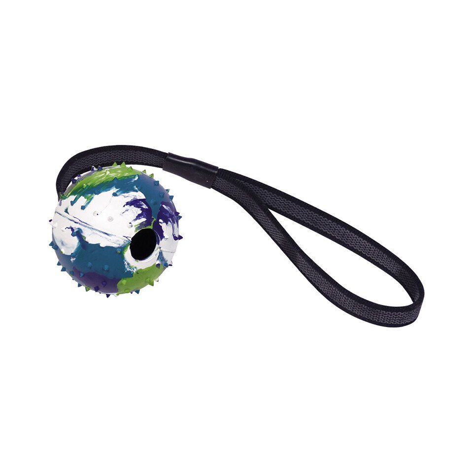 Dieser Spielzeug Ball besteht aus Vollgummi in bunter Camouflage Optik. Mit der Zackung sorgt der Ball für eine intensive Pflege der Zähne Ihres Hundes und bietet ihm gleichzeitig ein besonderes Kauvergnügen. Vollgummi ist ein sehr robustes Material, das ein langes Spielvergnügen sichert. Zusätzlich ist der Ball mit einem Anti-Slip Gurt ausgestattet.