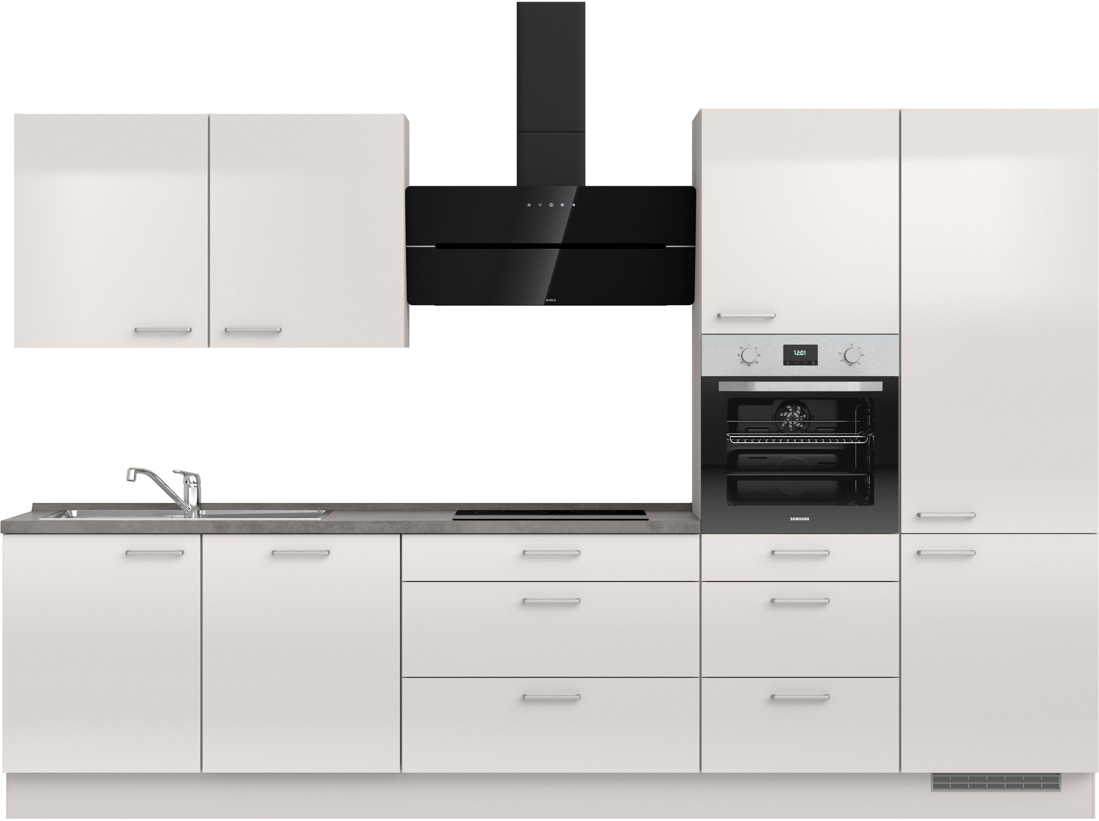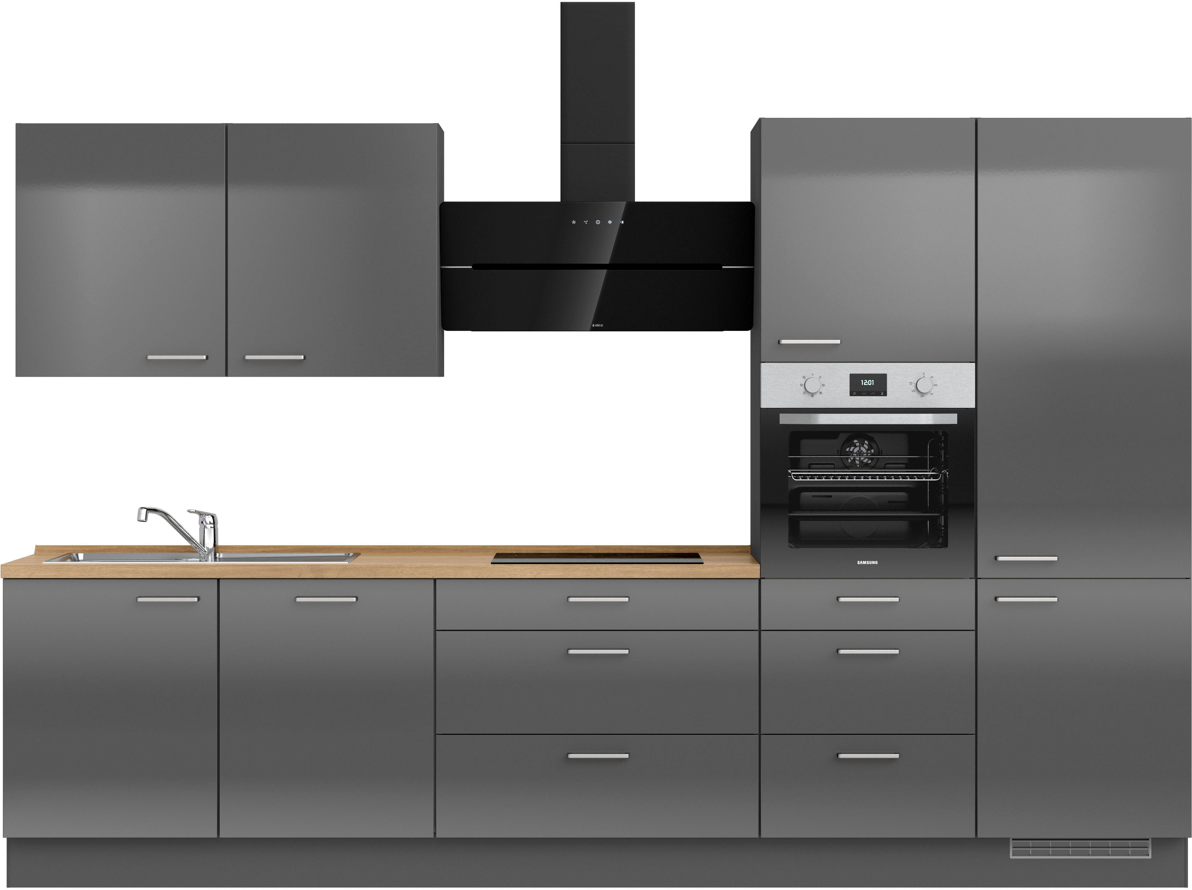 Ausstattung | Durchgehende Arbeitsplatte Einlegeböden höhenverstellbar Schubkästen mit Soft-Close-Funktion Türen mit Soft-Close-Funktion Wandabschlussleiste |