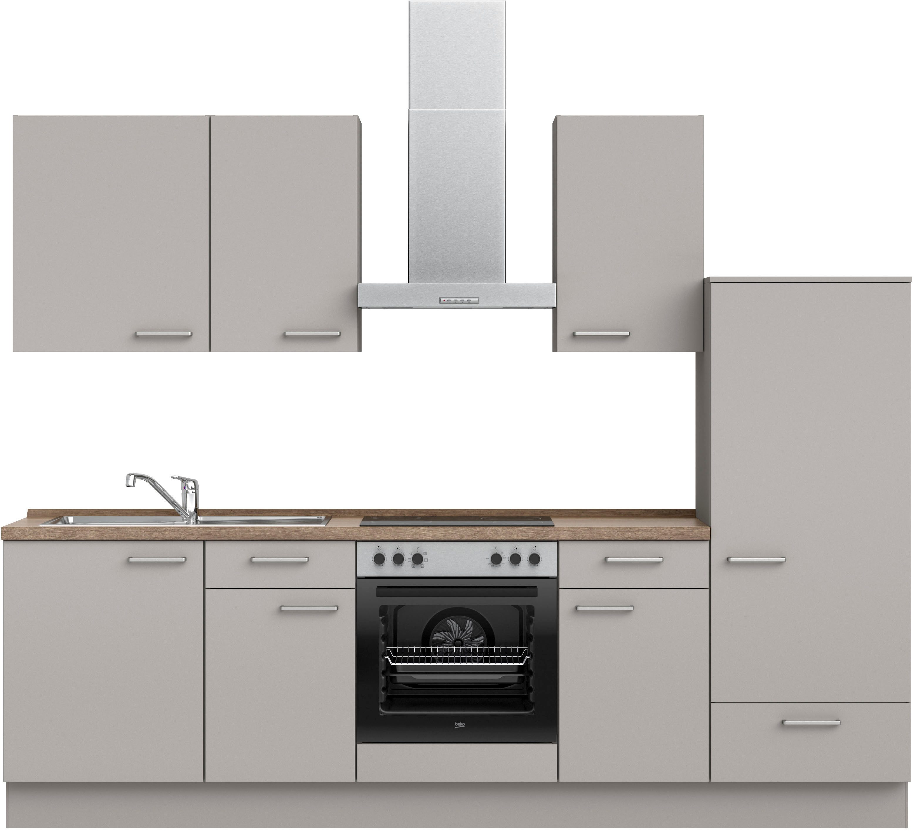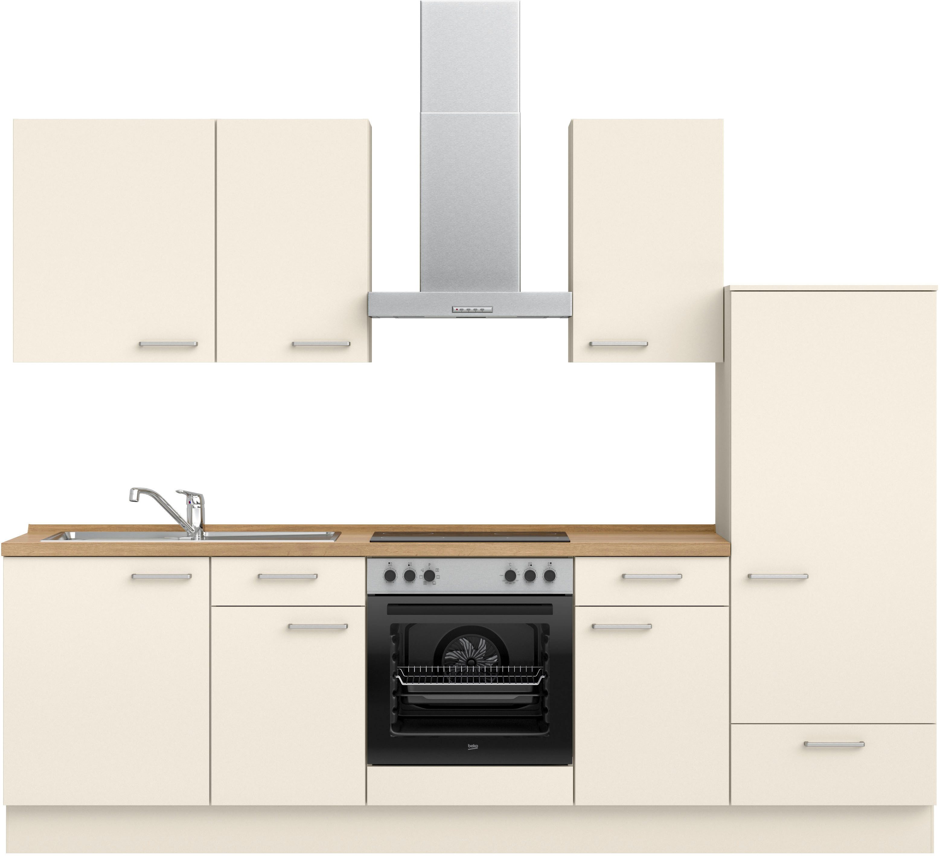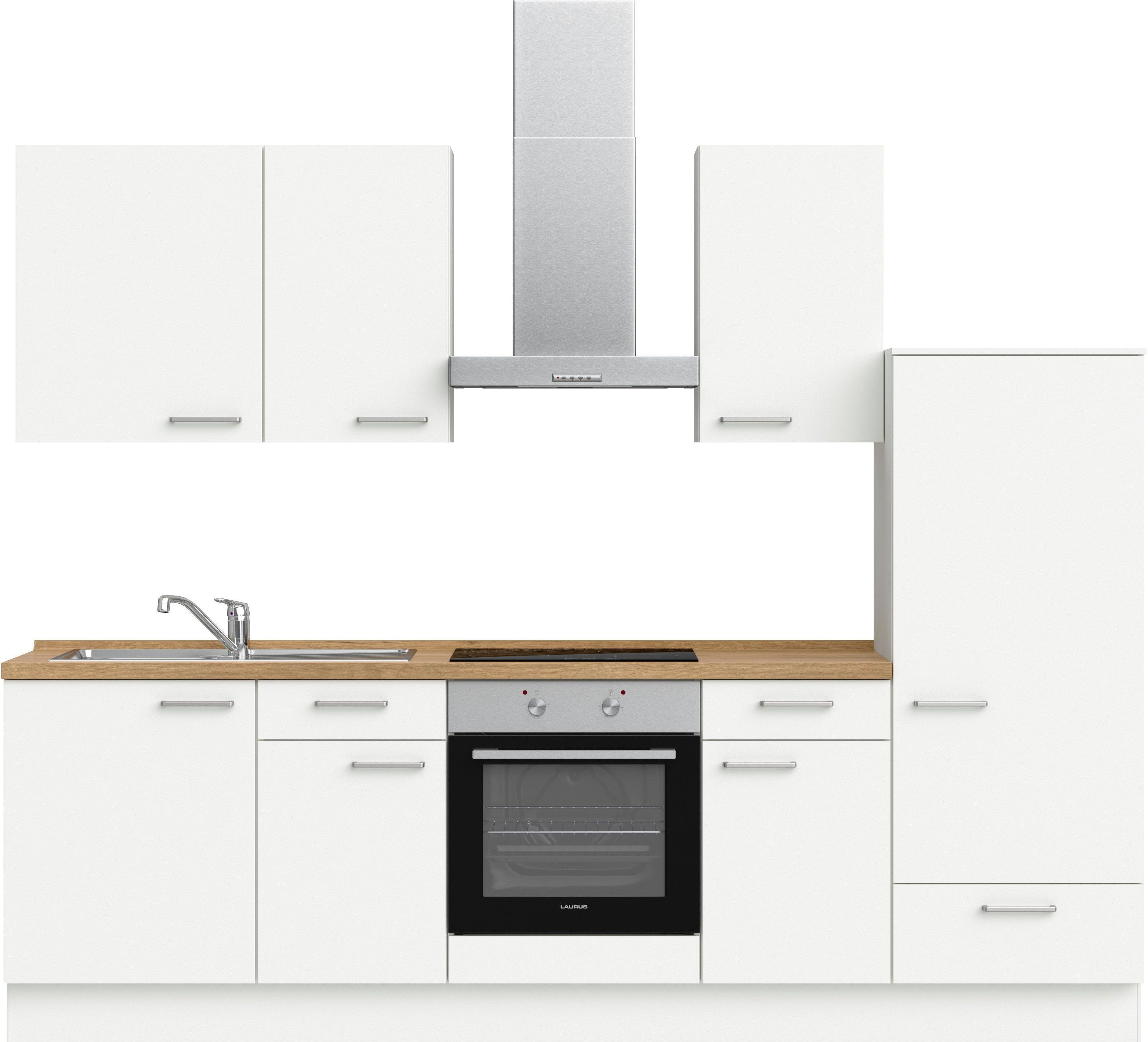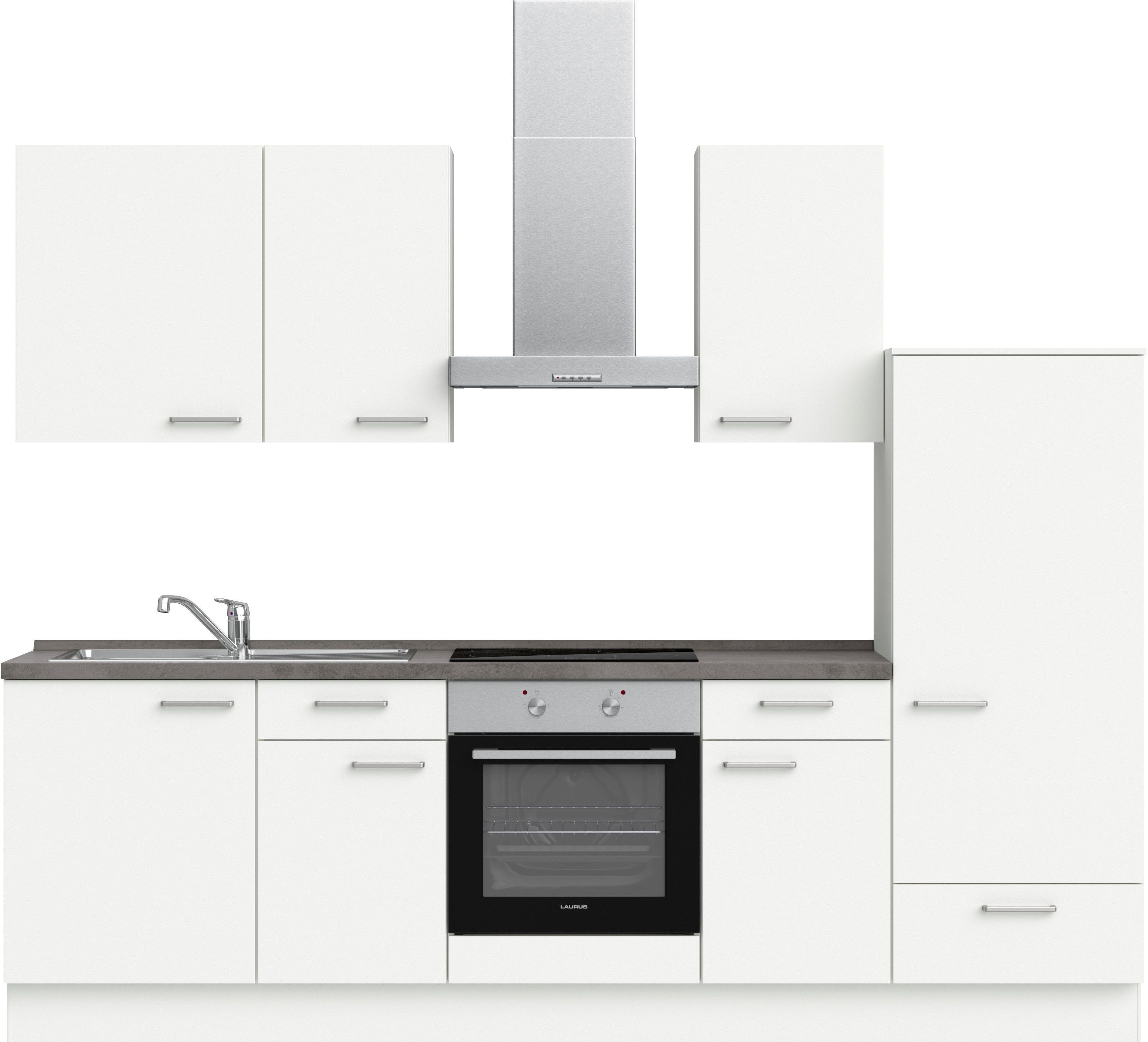 Ausstattung | Durchgehende Arbeitsplatte Einlegeböden höhenverstellbar Metallgriffe Schubkästen mit Soft-Close-Funktion Türen mit Soft-Close-Funktion Wandabschlussleiste |