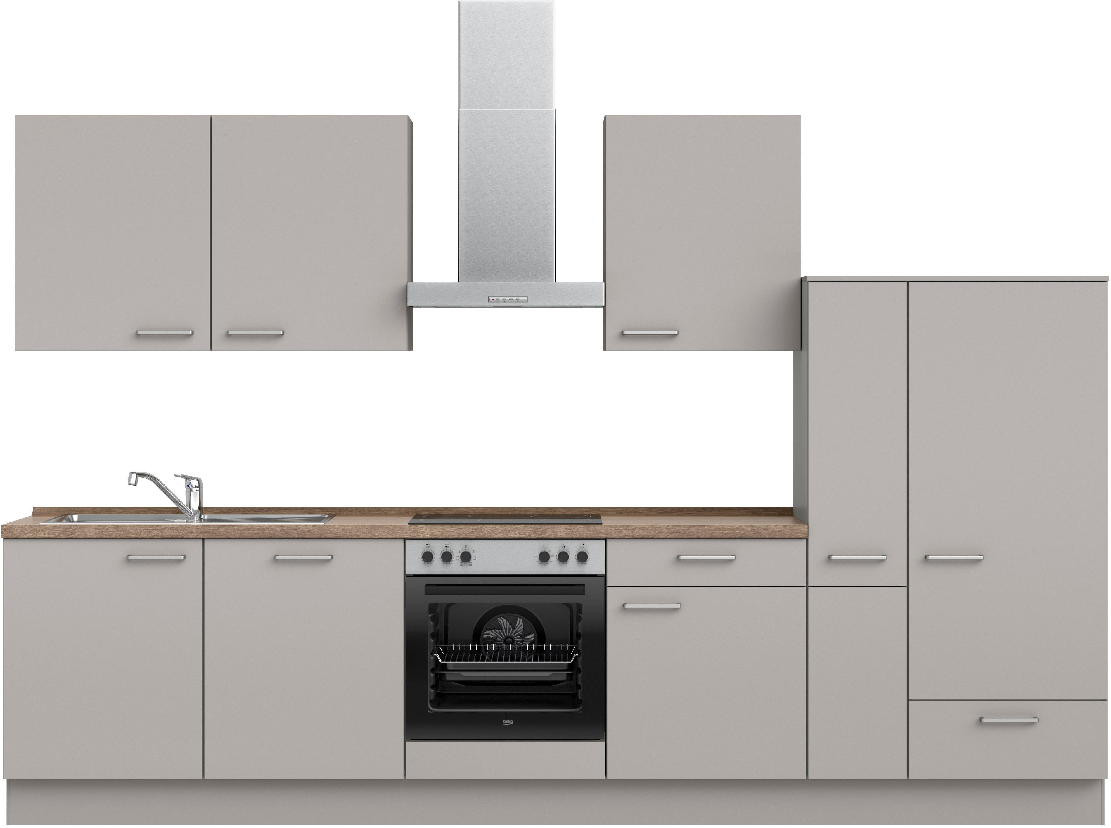 Ausstattung | Durchgehende Arbeitsplatte Einlegeböden höhenverstellbar Metallgriffe Schubkästen mit Soft-Close-Funktion Türen mit Soft-Close-Funktion Wandabschlussleiste |