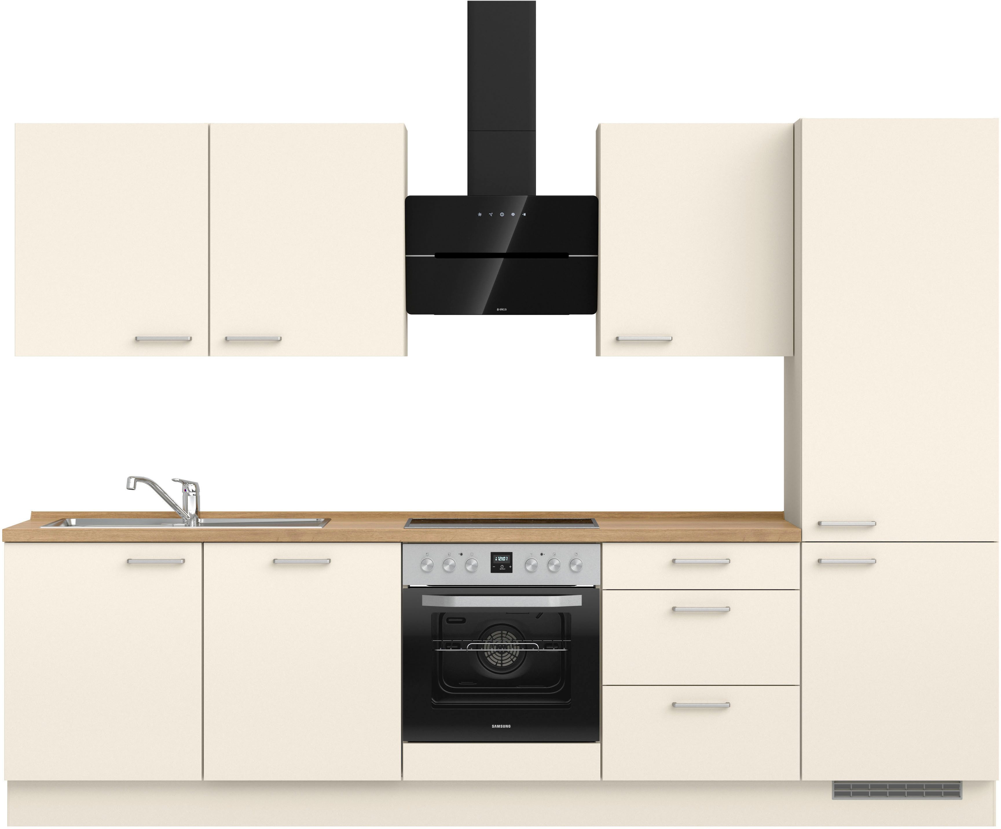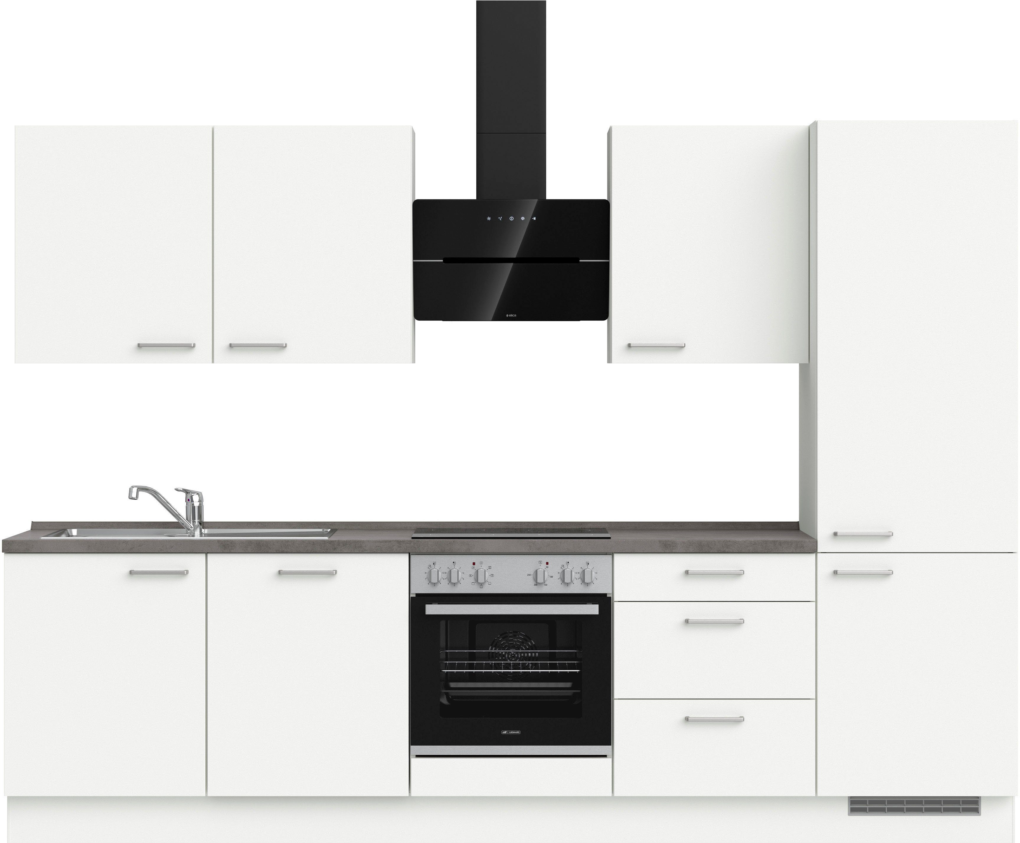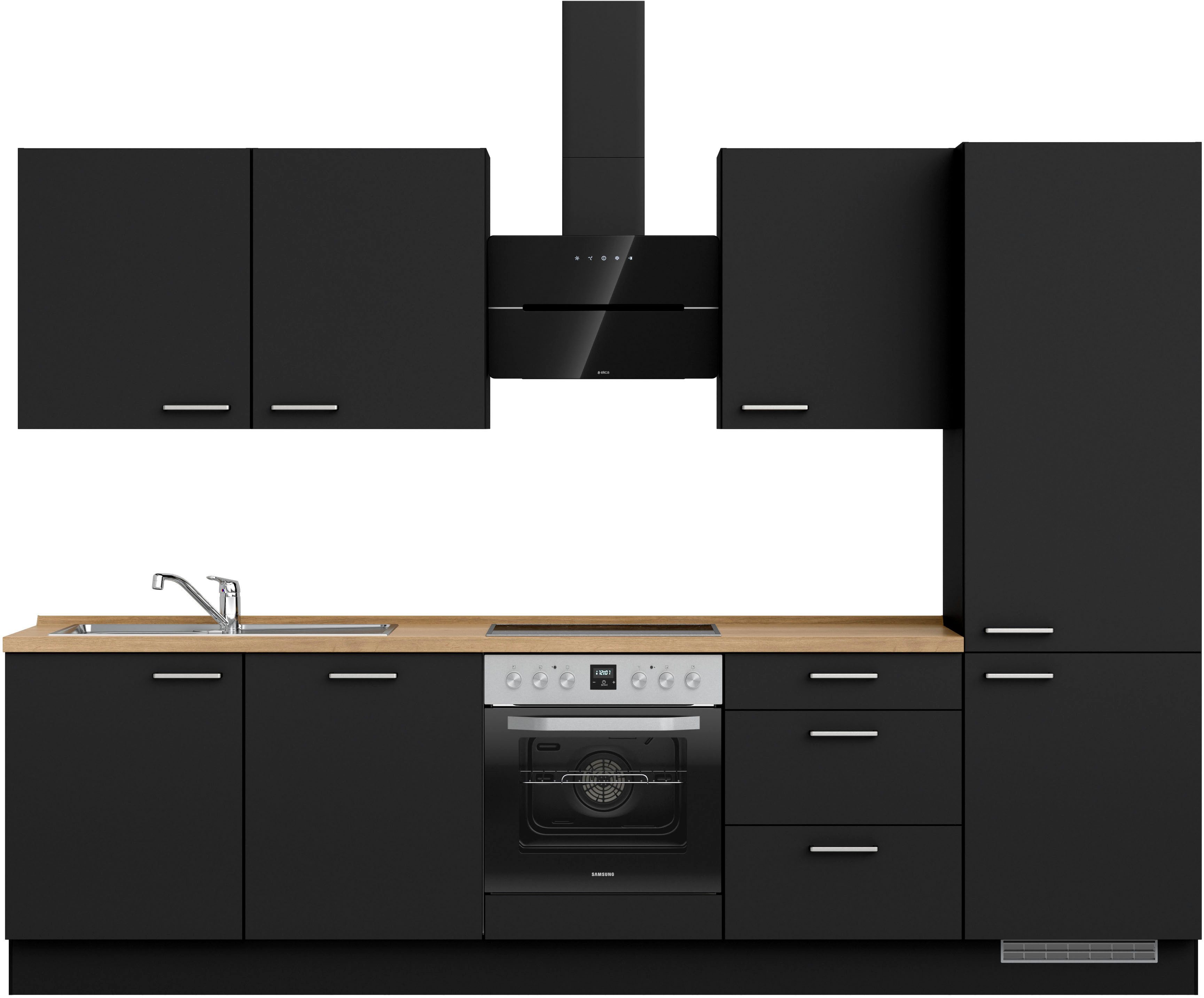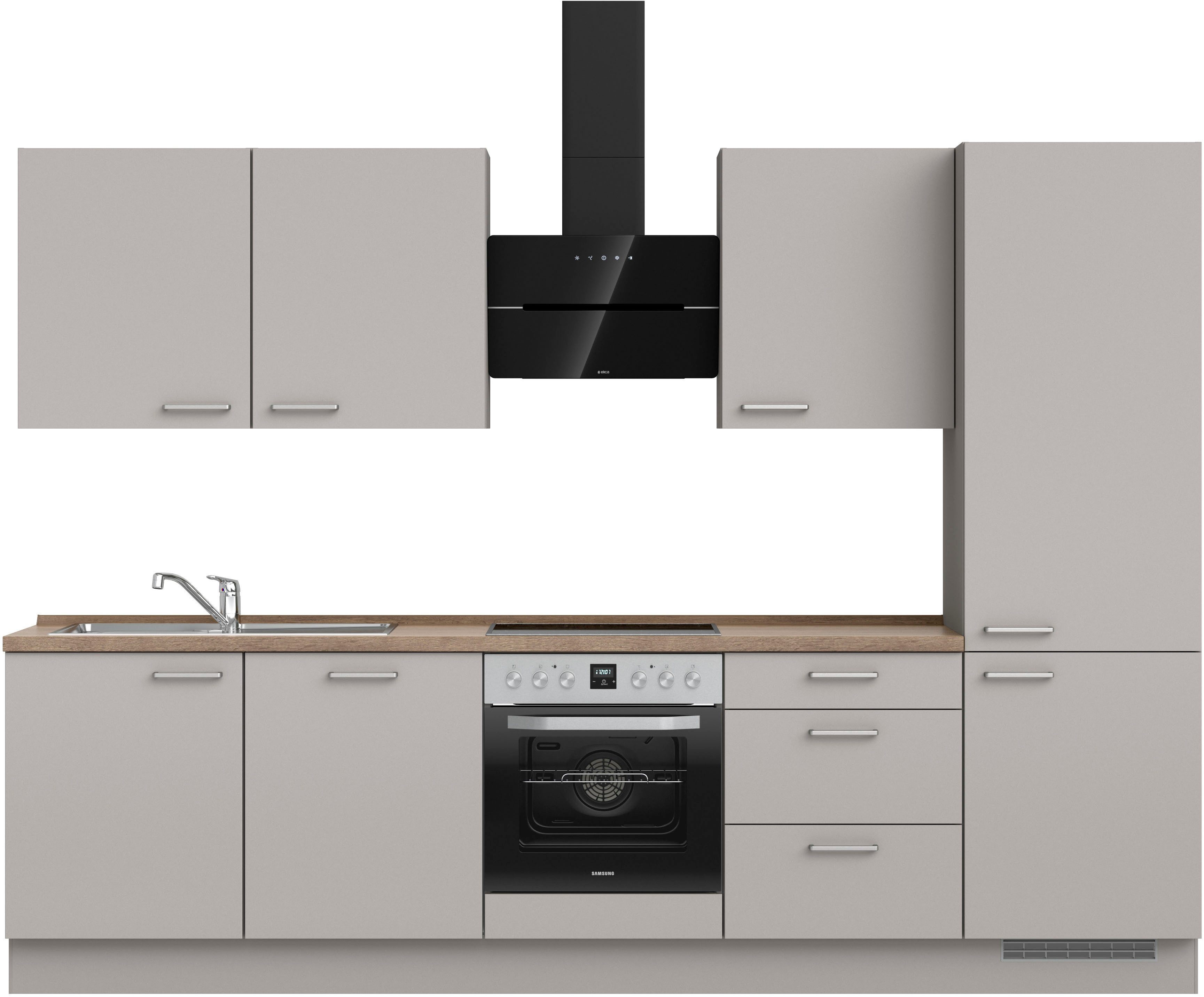 Ausstattung | Durchgehende Arbeitsplatte Einlegeböden höhenverstellbar Metallgriffe Schubkästen mit Soft-Close-Funktion Türen mit Soft-Close-Funktion Wandabschlussleiste |