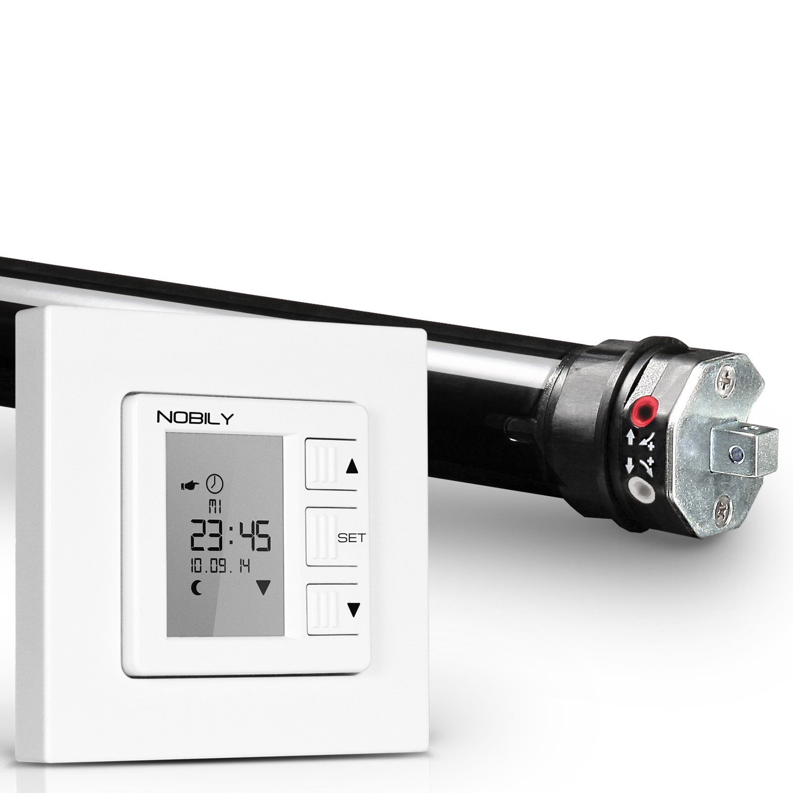 Lieferumfang | 1x Rolladenmotor, 1x Zeitschaltuhr, 1x 40mm Achtkantadaptersatz, 1x Universallager |