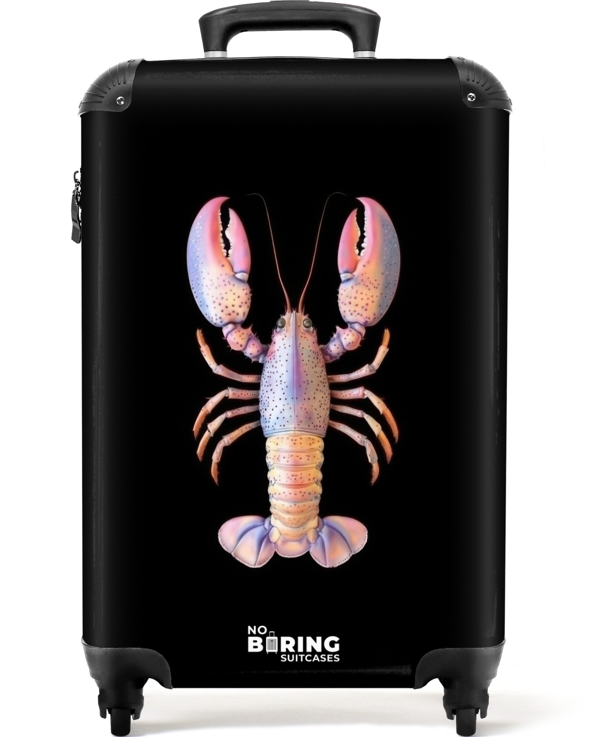 Ein Hummer in sanften Pastellfarben mit rosa-blauem Schimmer und zarten Punkten, zentriert auf schwarzem Hintergrund.Optik | bedruckt |