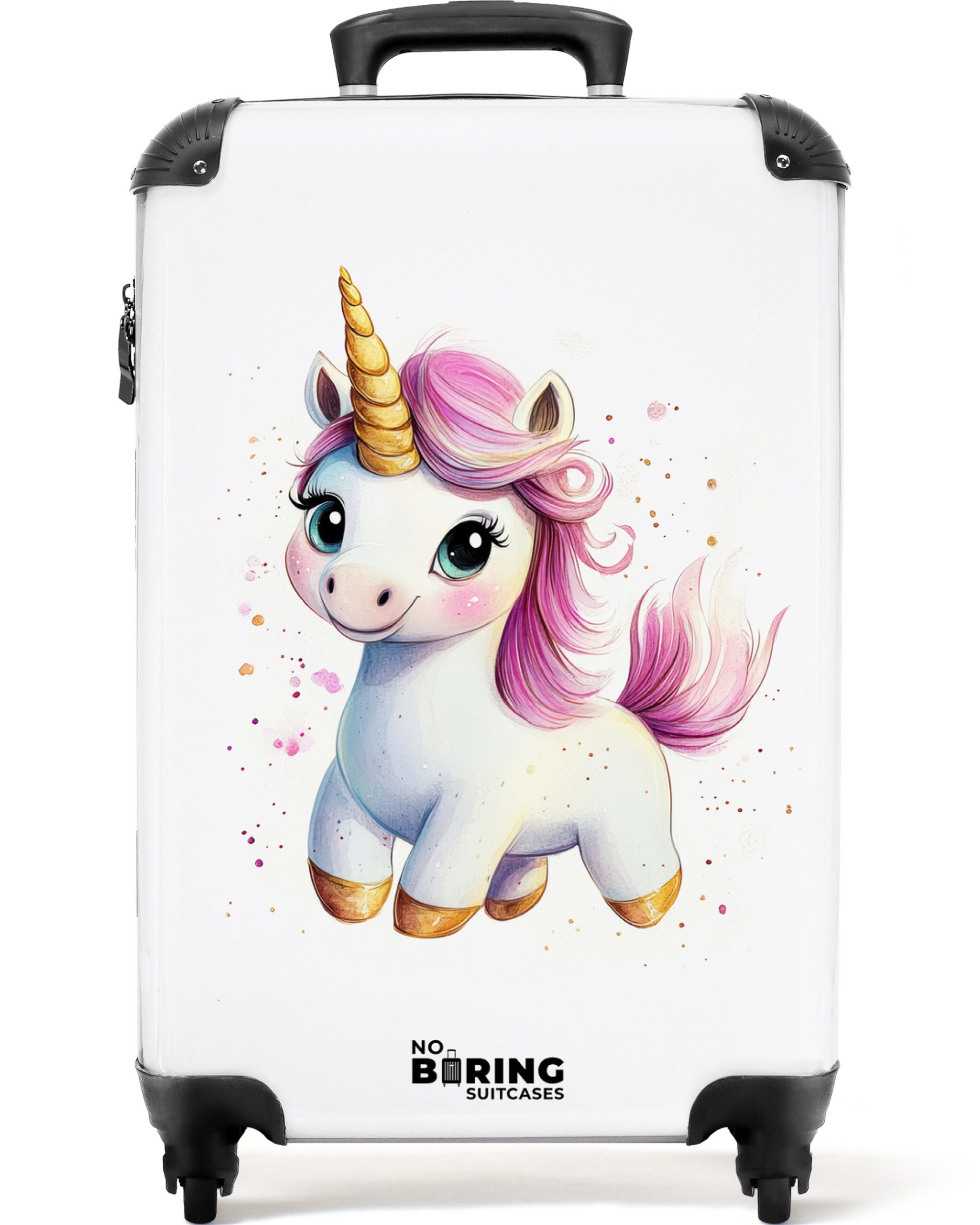 Ein bezauberndes weißes Einhorn blickt mit großen Augen fröhlich vor sich hin. Ihre Mähne ist rosa und gewellt, ihre Hufe und ihr Horn schimmern golden. Farbige Spritzer umgeben es in einem verspielten und leicht minimalistischen Design.Optik | bedruckt |