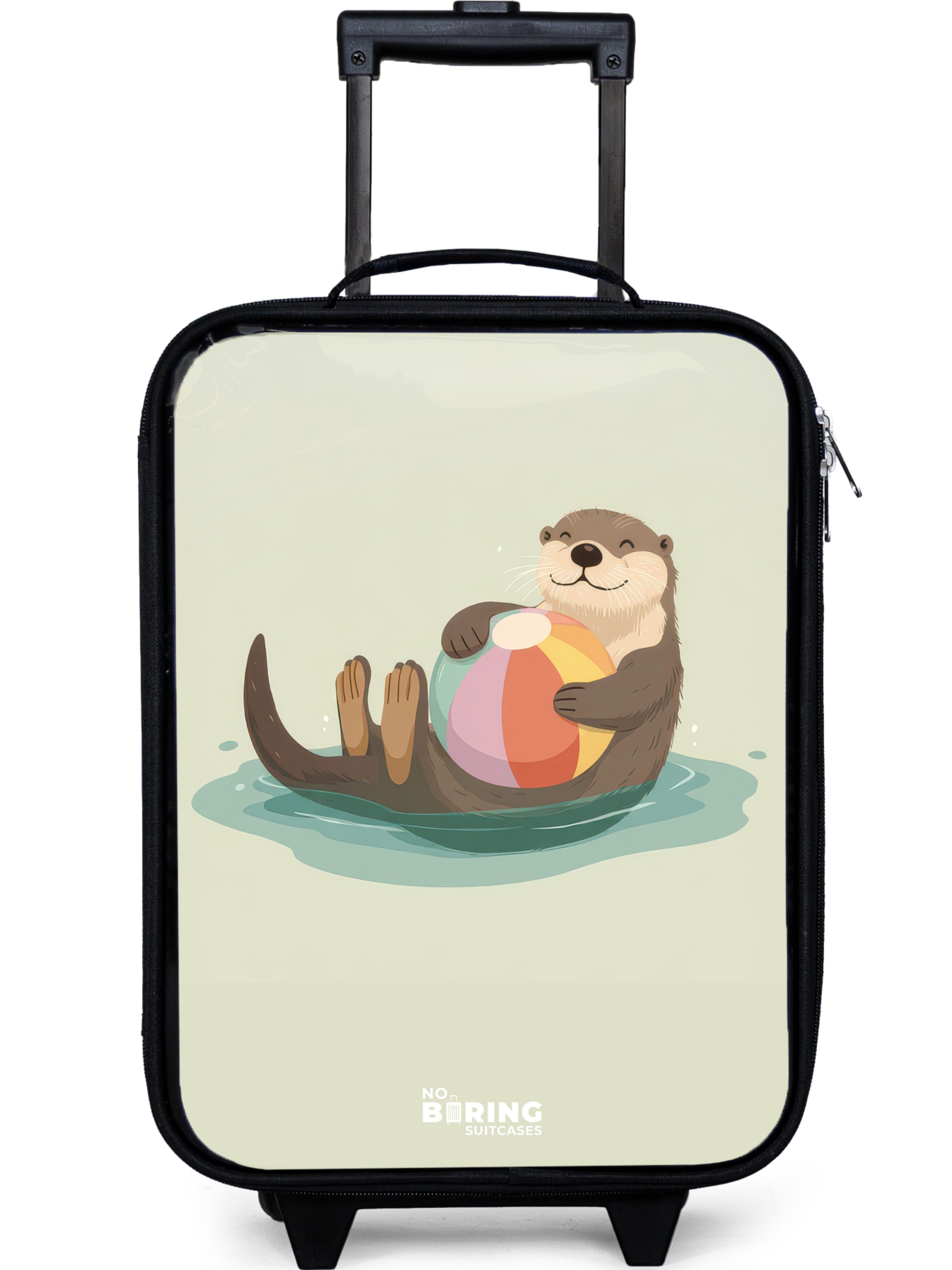 Ein lächelnder Otter liegt auf dem Rücken in einem Wasserbecken und hält einen bunten Strandball an seine Brust. Seine Augen sind geschlossen und er strahlt Frieden und Freude aus. Der Hintergrund ist blassgrün und leer.
