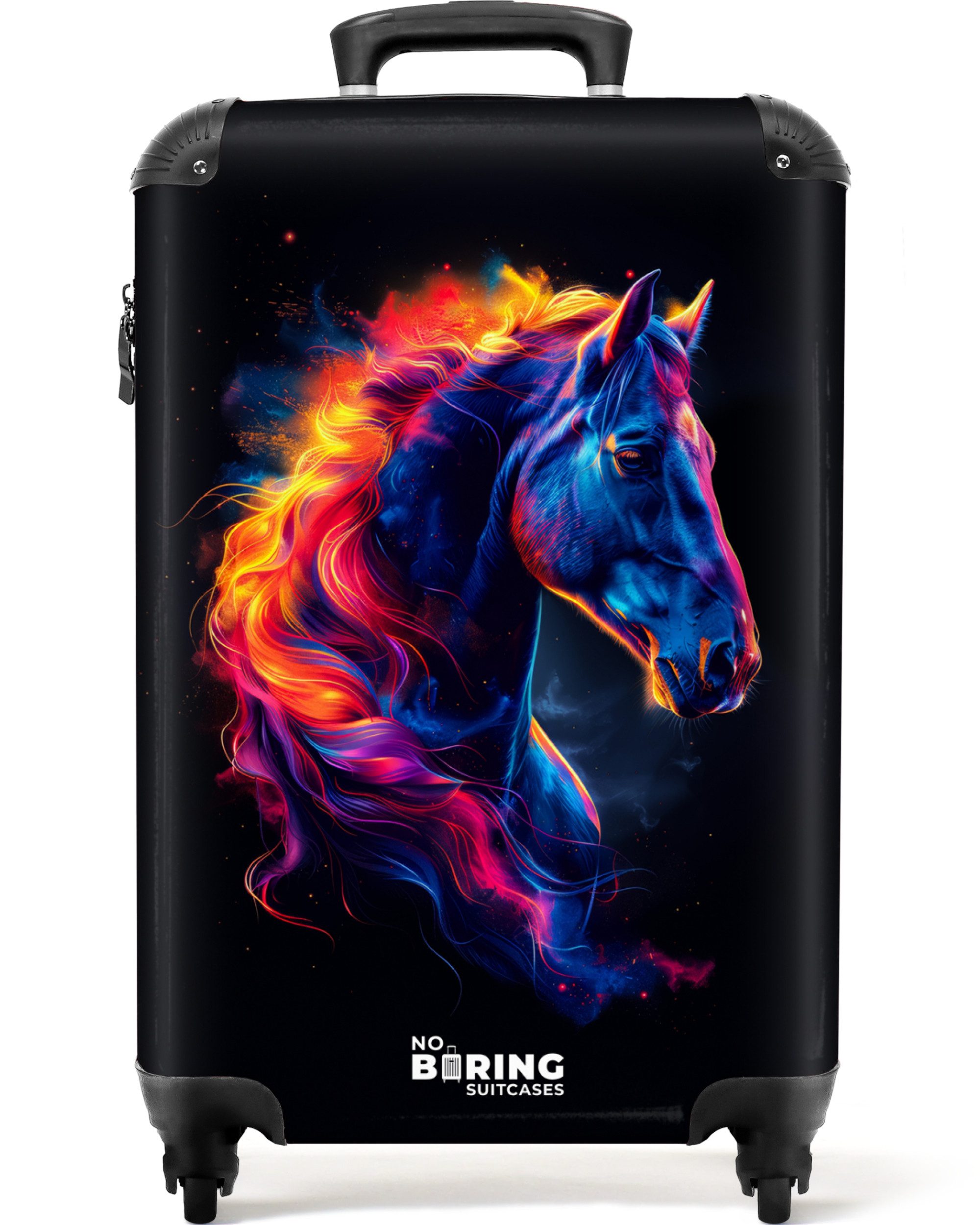 Ein farbenfrohes Porträt eines Pferdes mit einer feurigen Mähne vor einem schwarzen Hintergrund. Die leuchtenden Farben in Rot, Orange und Blau heben sich vom dunklen Hintergrund ab.Optik | bedruckt |