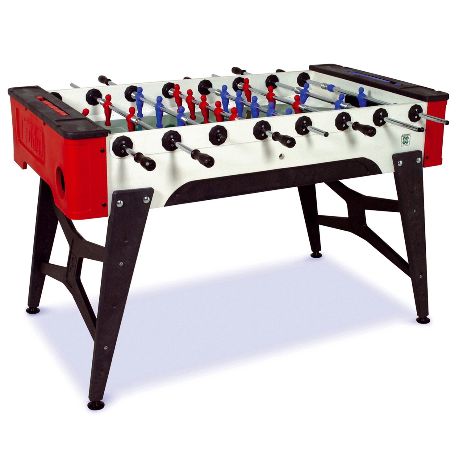 Ausstattung | Kunstharz-, Fiberglas- und Edelstahl-Komponenten 16 mm gleitgelagerte Spielstangen speziell gefederte Stangen Spielfeld aus Glas inklusive 10 Outdoor Kickerbälle Griffhöhe: 84 cm |