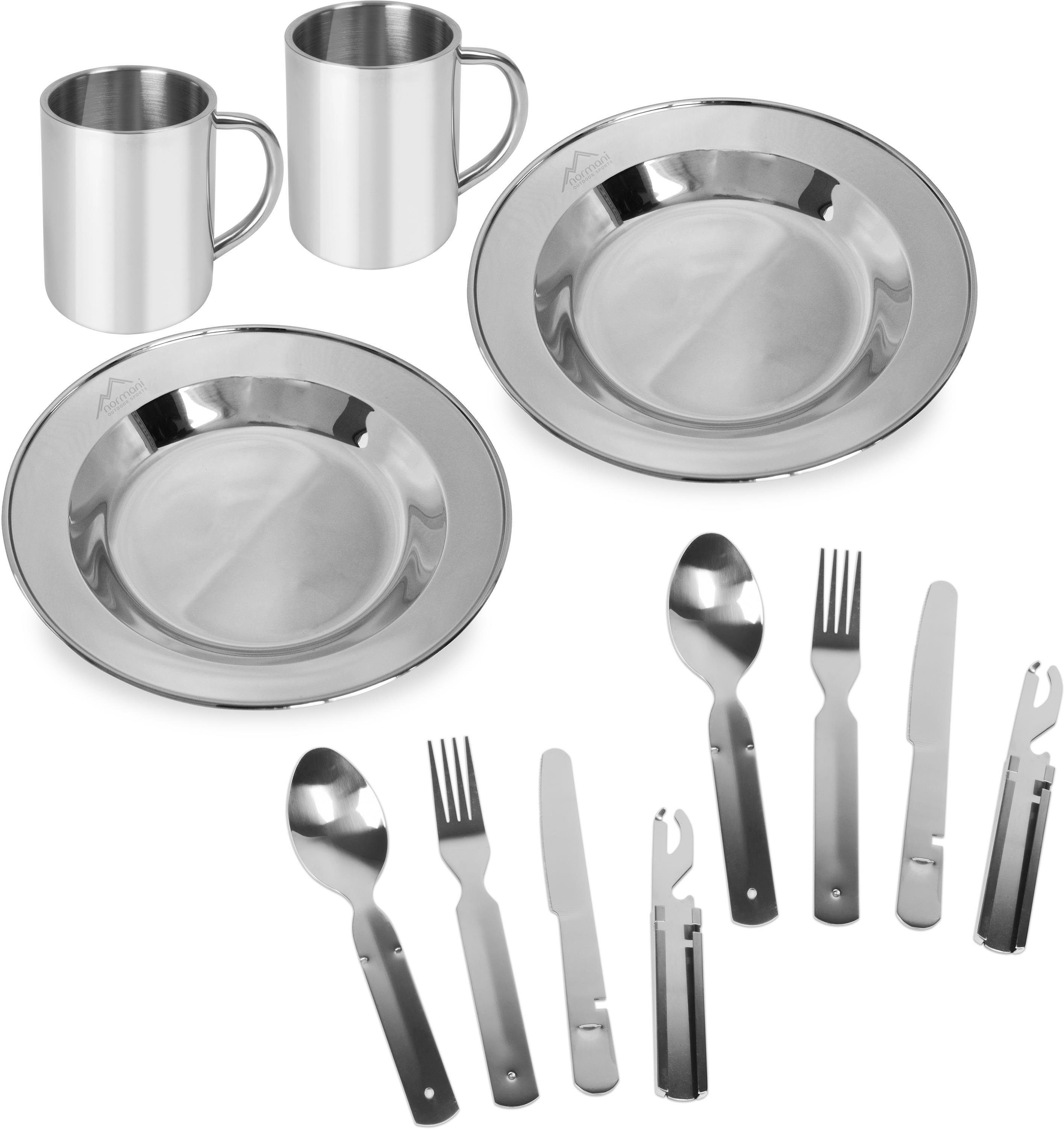 Dieses hochwertige Set bestehend aus 2 x Edelstahl Suppenteller (22cm), 2 x doppelwandige Edelstahl Tasse (0,25l), sowie 2 x Essbesteck-Set ist ein Muss für jeden Outdoor-Liebhaber.