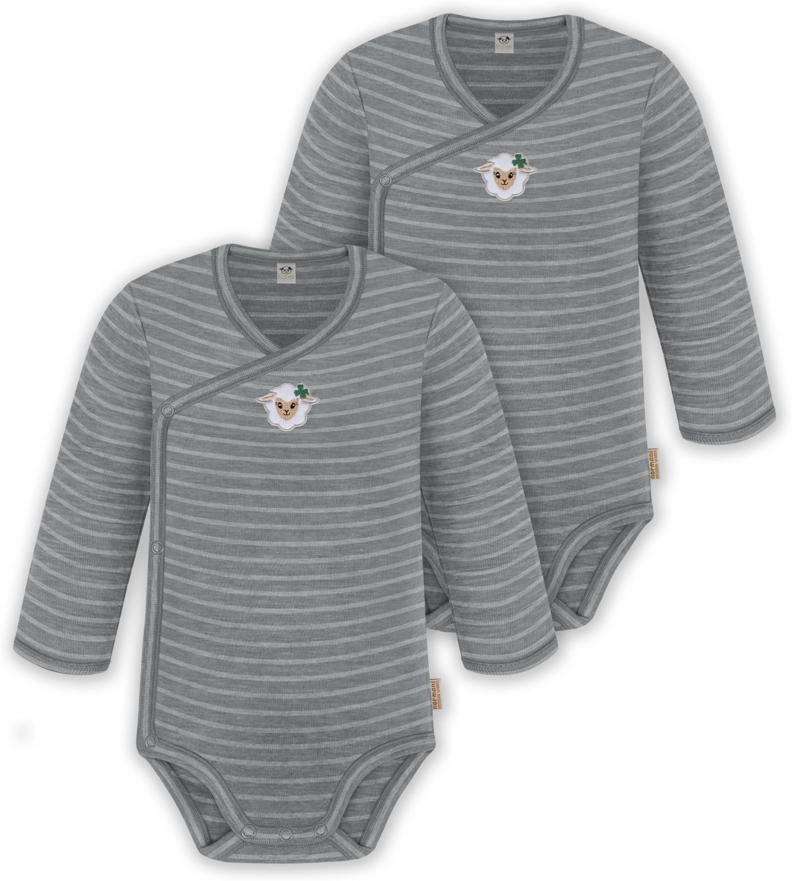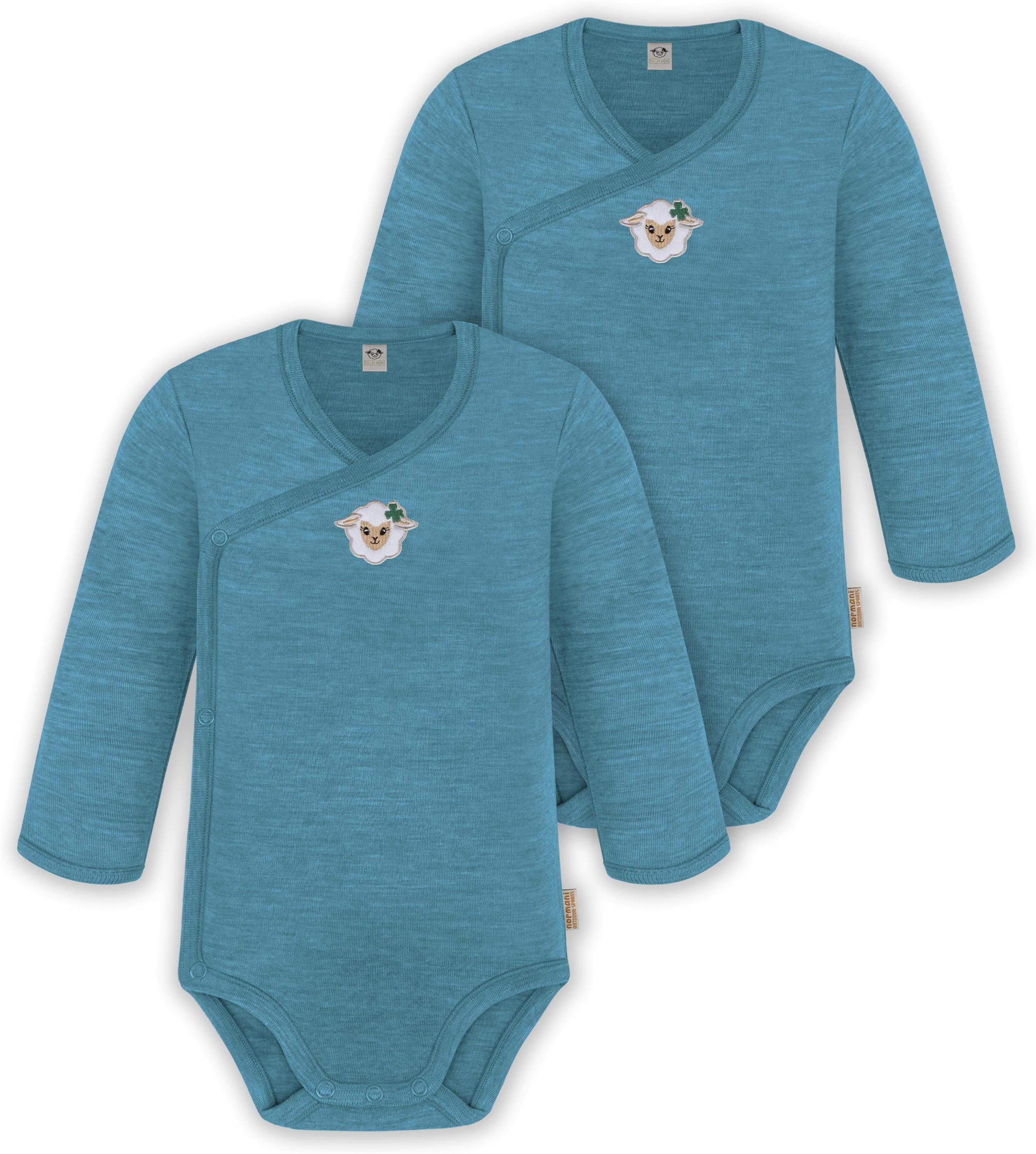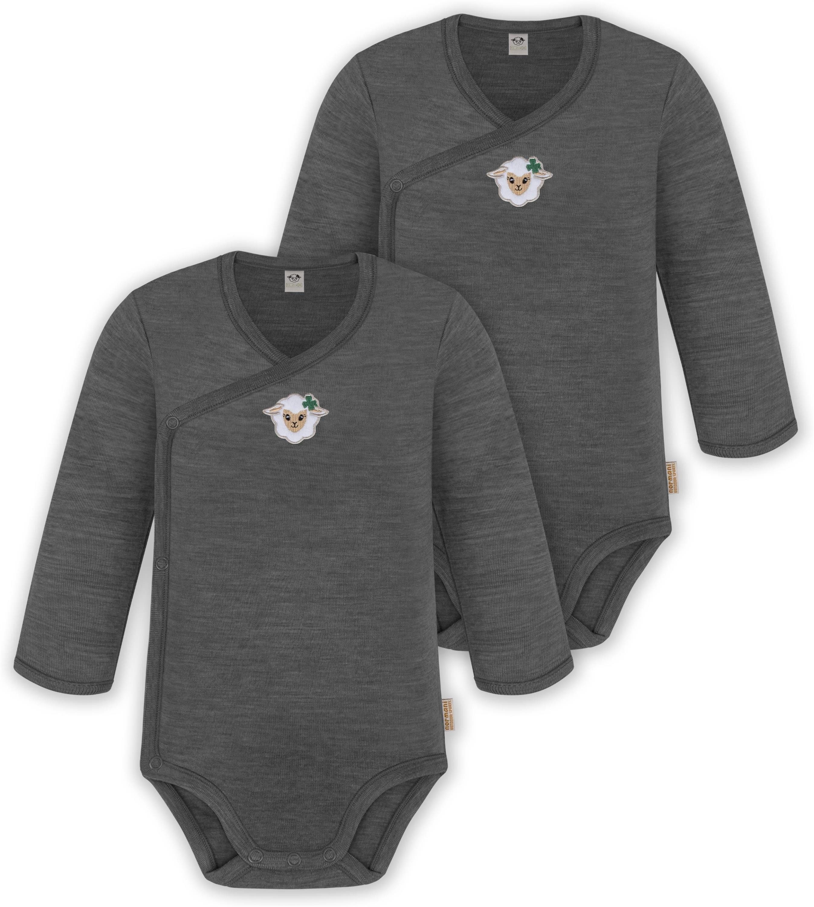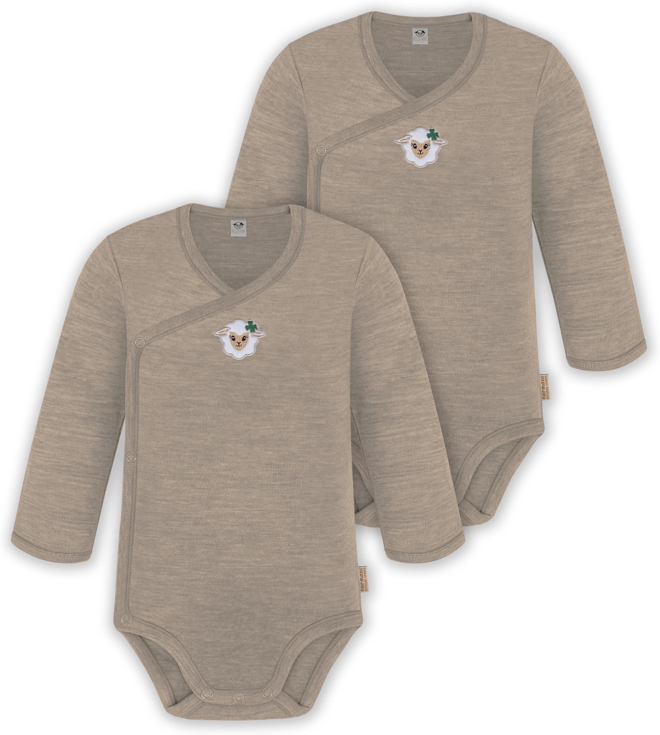 Unser Merino Wickelbody Body "Kaitaia", im 2er Pack, ist mehr als nur ein einfacher Baby Body mit langen Ärmeln. Hinter seiner schlichten Erscheinung verbirgt sich ein Kleidungsstück, das sich perfekt für alle Wetterbedingungen eignet. Mit einer Grammatur von 200 g/m² bietet dieser Body eine optimale Wärmeisolierung, die ihn im Winter zur idealen wärmenden Schicht unter weiterer Kleidung macht. Auch im Sommer kann der Body wegen seiner natürlichen Thermoregulierung einzeln getragen werden. Die Wärmeregulierung und Atmungsaktivität der Merinowolle ermöglichen es Ihrem Baby, den Body den ganzen Tag über zu tragen – sei es beim Spielen oder beim Nickerchen. Die weiche Merinowolle ist besonders sanft zur empfindlichen Haut Ihres Babys und verursacht keine Hautirritationen. Zudem ist die Merinofaser geruchsneutralisierend, sodass der Body auch nach mehrmaligem Tragen frisch bleibt. Die Elastizität der Merinowolle sorgt für maximale Bewegungsfreiheit beim Spielen. Der Wickelbody zeichnet sich besonders dadurch aus, dass er nicht über den Kopf Ihres Babys gezogen werden muss, sondern um Ihr Baby herumgewickelt wird. Darüber hinaus ist der Body mit hochwertigen Marken-Druckknöpfen von YKK zwischen den Beinen und an den Seiten ausgestattet, die ein zuverlässiges Öffnen und Спрятать gewährleisten und das Wickeln erleichtern. Abgerundet wurde der Body mit einem kindgerechtem, flauschigem Schaf Stick, der als Eyecatcher dient.